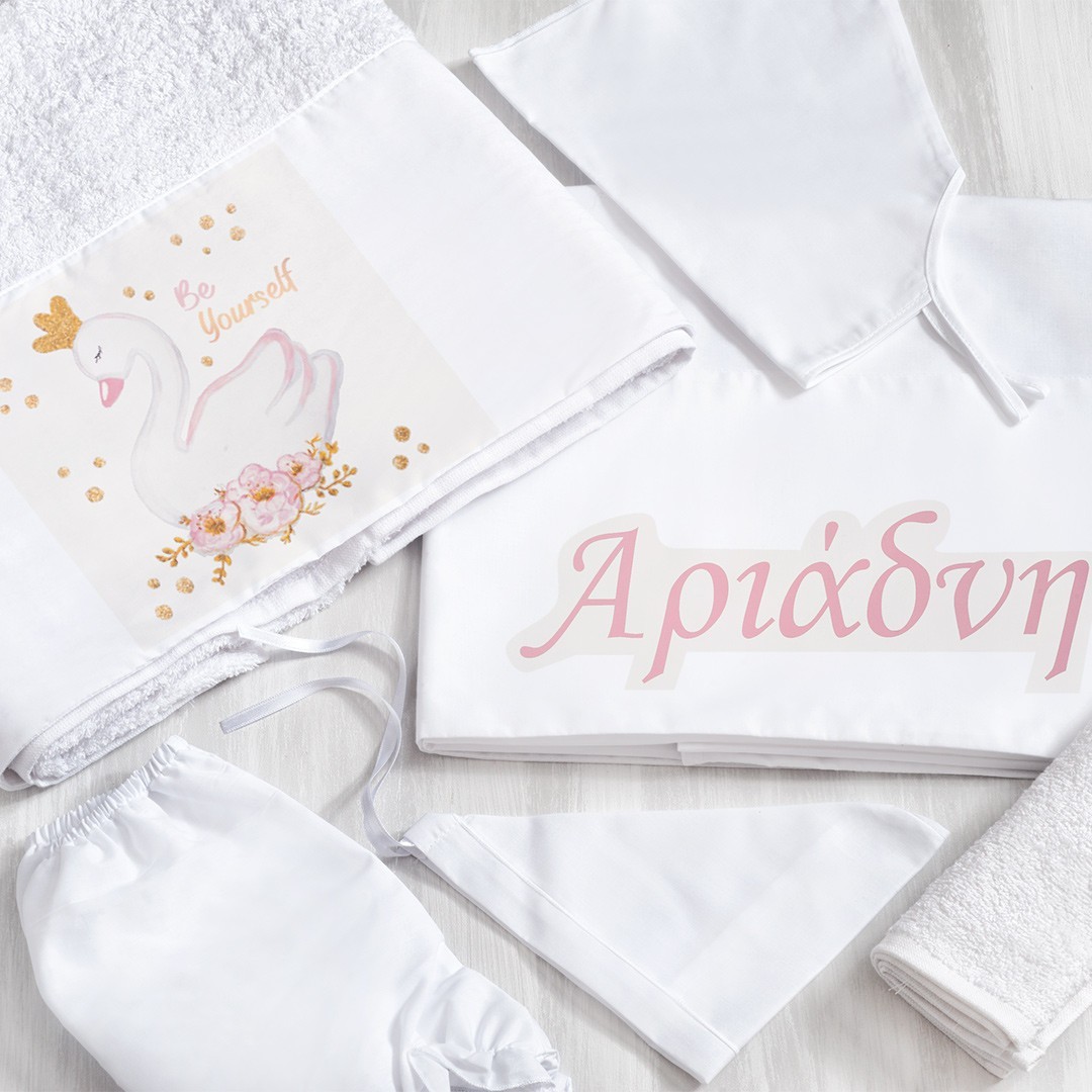 Σετ λαδόπανα βάπτισης για κορίτσι σε λευκό χρώμα ασορτί με εκτύπωση στο σετ βάπτισης που έχετε επιλέξει.Στο σετ περιλαμβάνεται το λαδόπανο, τα εσώρουχα,η πετσέτα η μεγάλη και η μικρή των χεριών