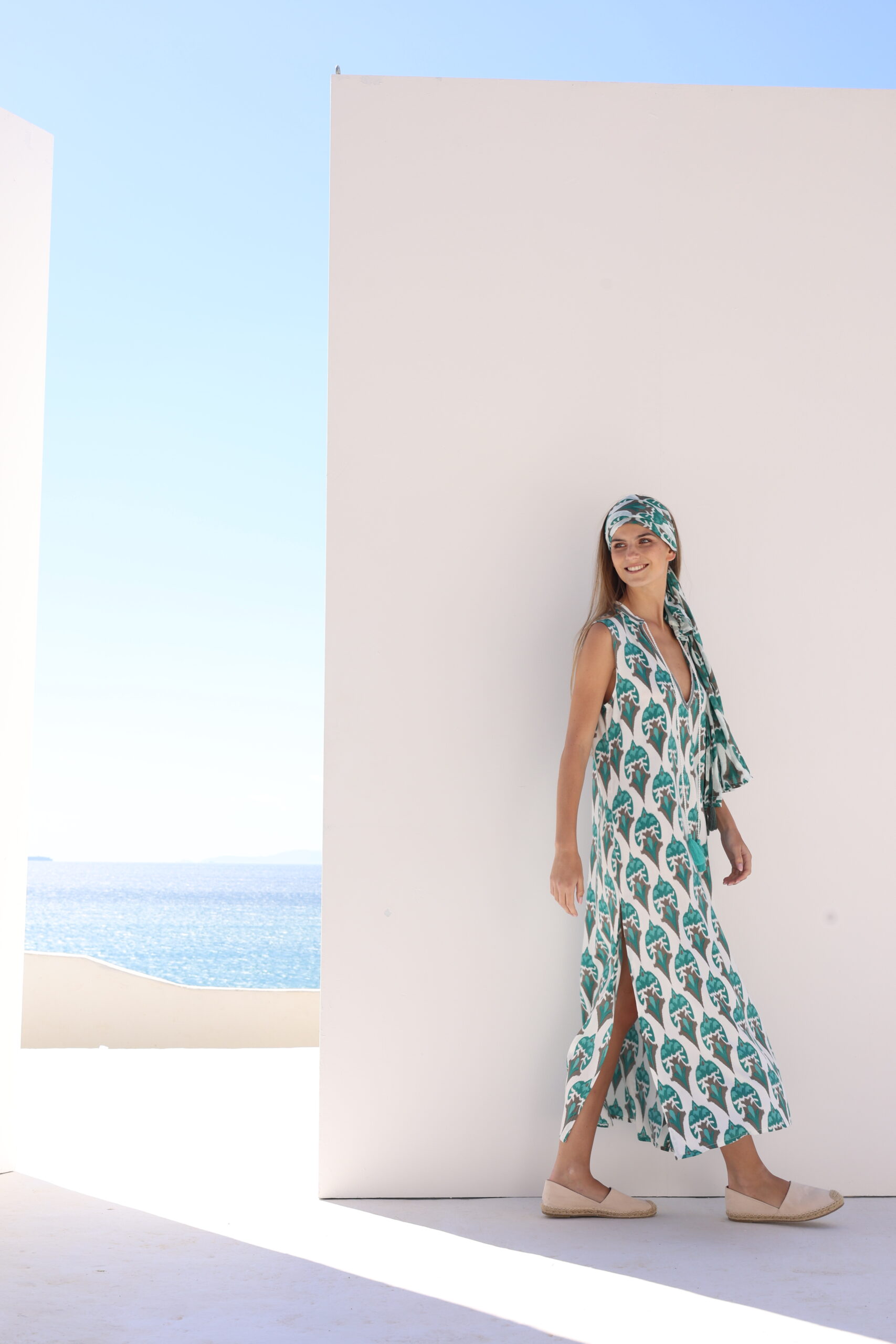 Γυναικείο μακρύ καφτάνι από βισκόζη, σε boho printed με V στο λαιμό και διακοσμητικό κορδόνι. Με σκισίματα στο τελείωμα στα πλάγια.