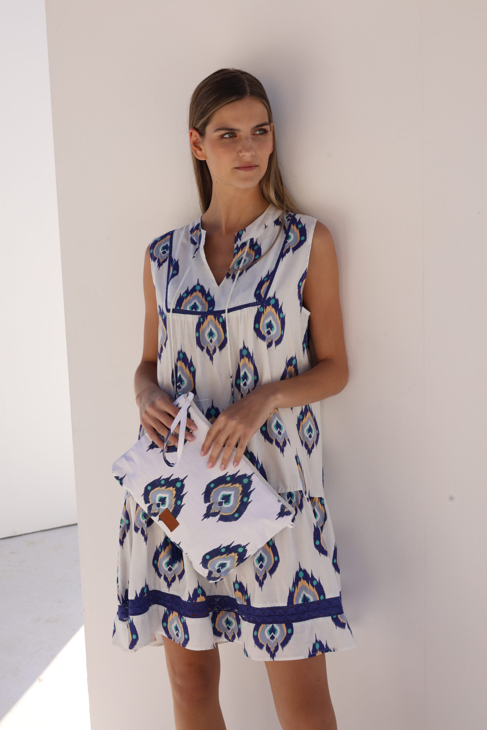 Γυναικείο αμάνικο φορέμα βισκόζη με δαντέλα λεπτομέρεια και διακοσμητικά κορδόνια στο στήθος.