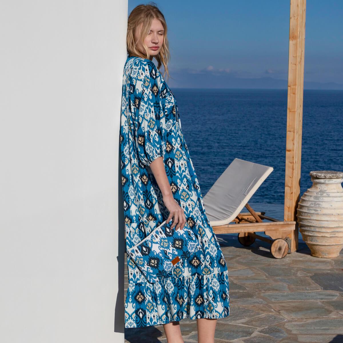 Γυναικείο μακρύ φόρεμα σε βισκόζη με μανίκι μέχρι τον άγκωνα, σε άνετη γραμμή με κορδόνι στο λαιμό.