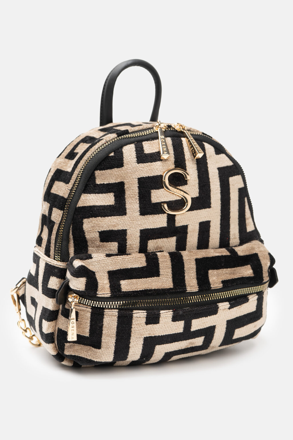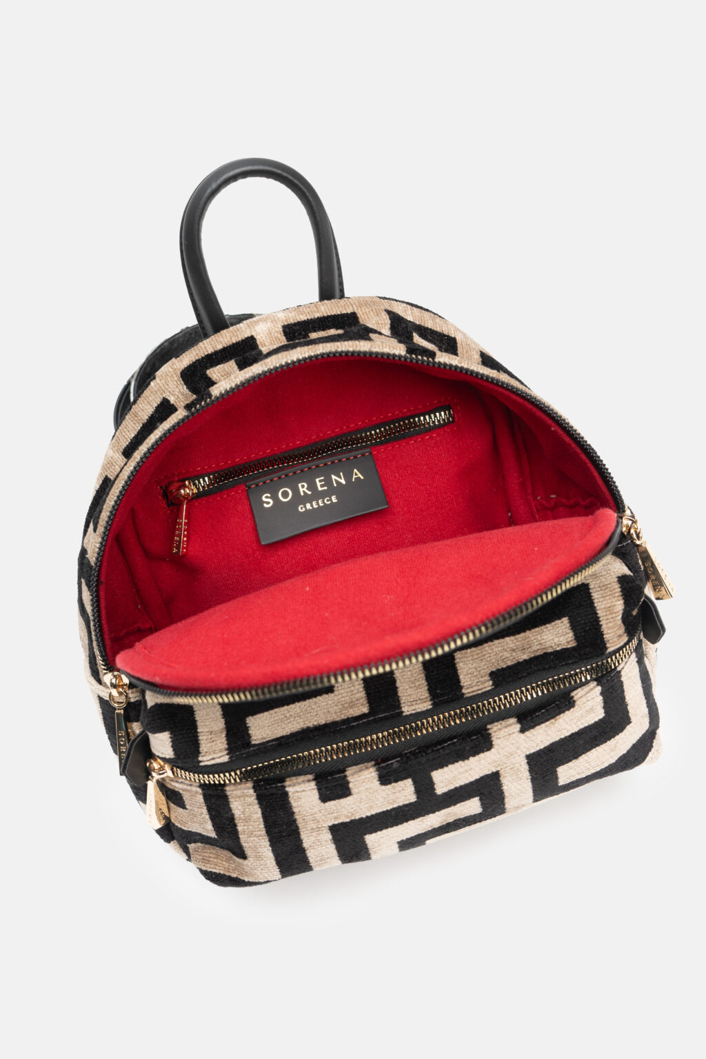 Elevate your everyday style with the Sorena Velvet Mini Backpack, a luxurious accessory that seamlessly blends elegance with functionality. Crafted from plush velvet and adorned with a geometric Greek Key pattern, this backpack is designed to turn heads.