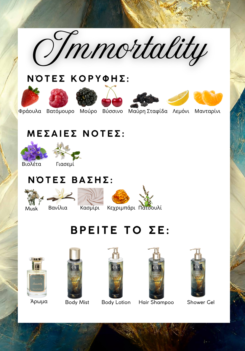 Αναδείξτε τη φυσική σας λάμψη με το Immortality – Body Lotion μια πολυτελής κρέμα σώματος που ενυδατώνει βαθιά, ενώ αγκαλιάζει το δέρμα με το μαγευτικό άρωμα του Immortality.