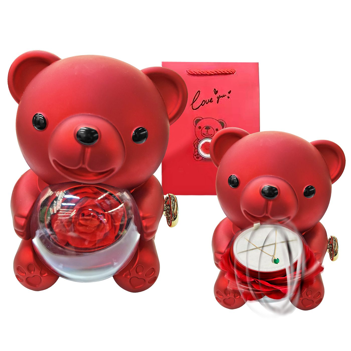 Παντοτινό τριαντάφυλλο αληθινό. Διάρκεια ζωής άνω των 5 ετών. Περιστρεφόμενο με κουμπί για να εμφανιστεί κόσμημα (δε περιέχει κόσμημα). 17x11x11cm