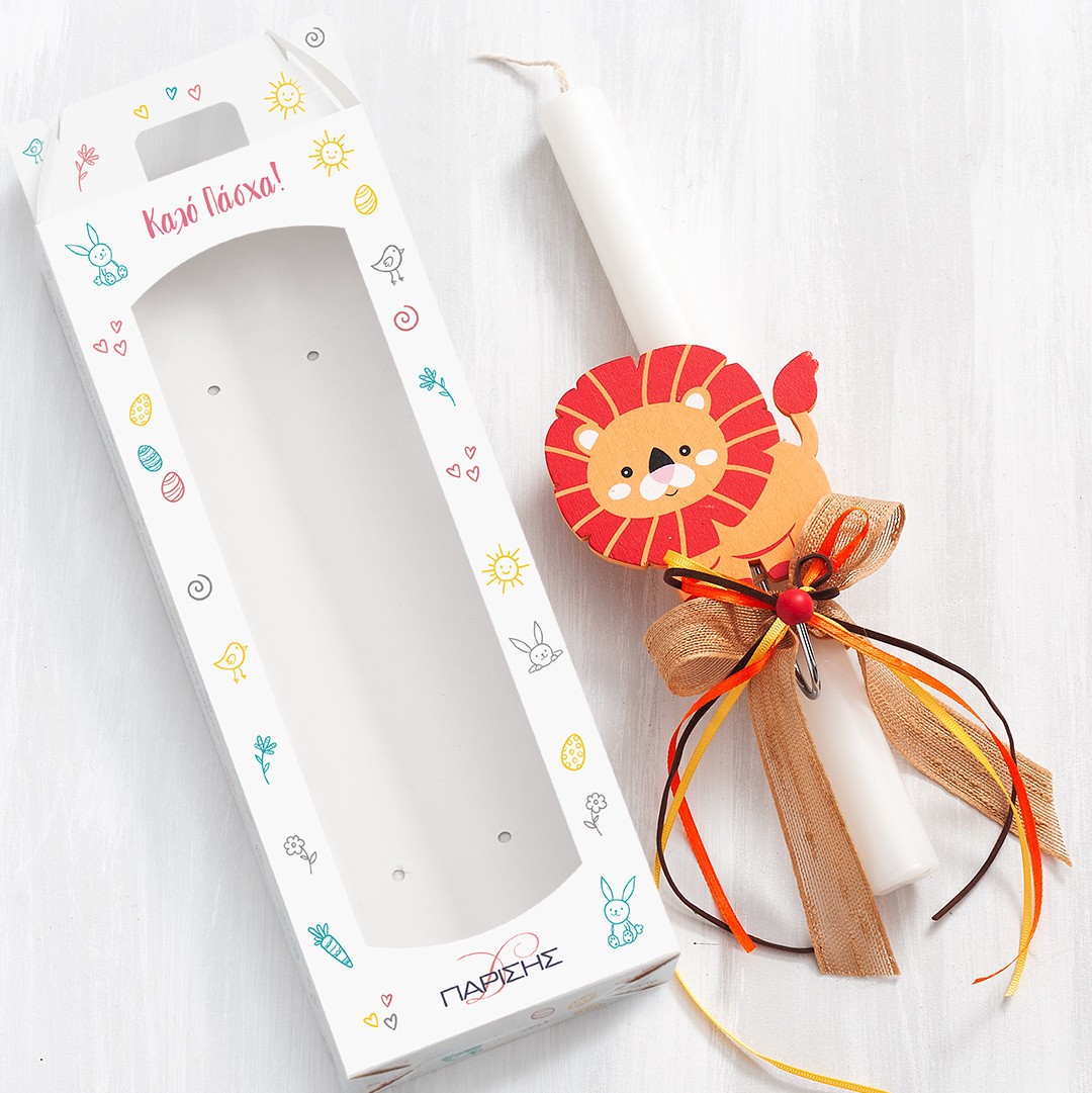 Πασχαλινή λαμπάδα με ξύλινη κρεμάστρα λιονταράκι.H λαμπάδα είναι διακοσμημένη με κορδέλες σε natural αποχρώσεις και είναι τοποθετημένη σε χάρτινο κουτί με παράθυρο.