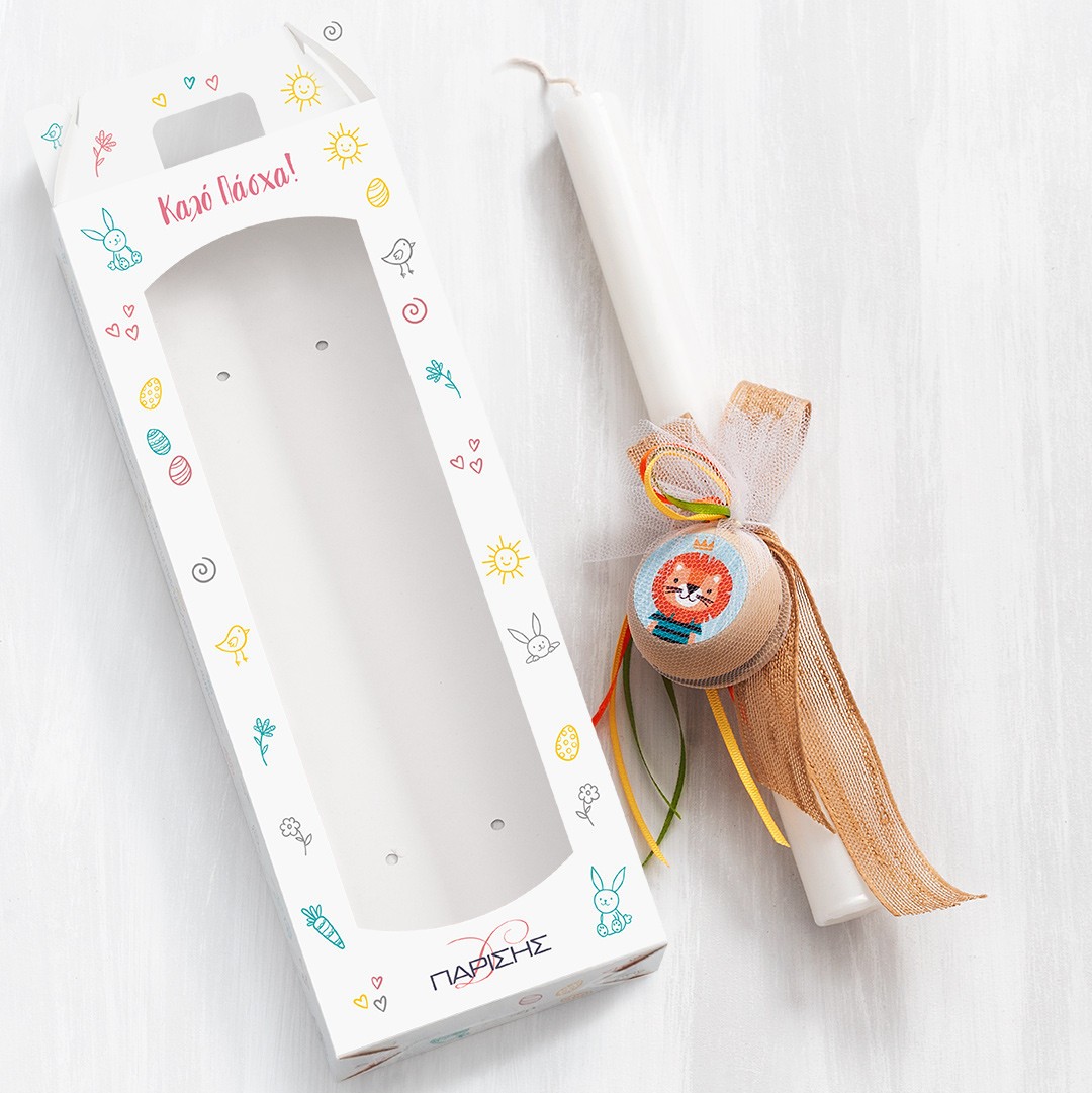 Πασχαλινή λαμπάδα με ξύλινο yo yo με αυτοκόλλητο λιονταράκι. Η λαμπάδα είναι στολισμένη με κορδέλες σε πορτοκαλί,κίτρινες και πράσινες αποχρώσεις και είναι τοποθετημένη σε χάρτινο κουτί με παράθυρο.