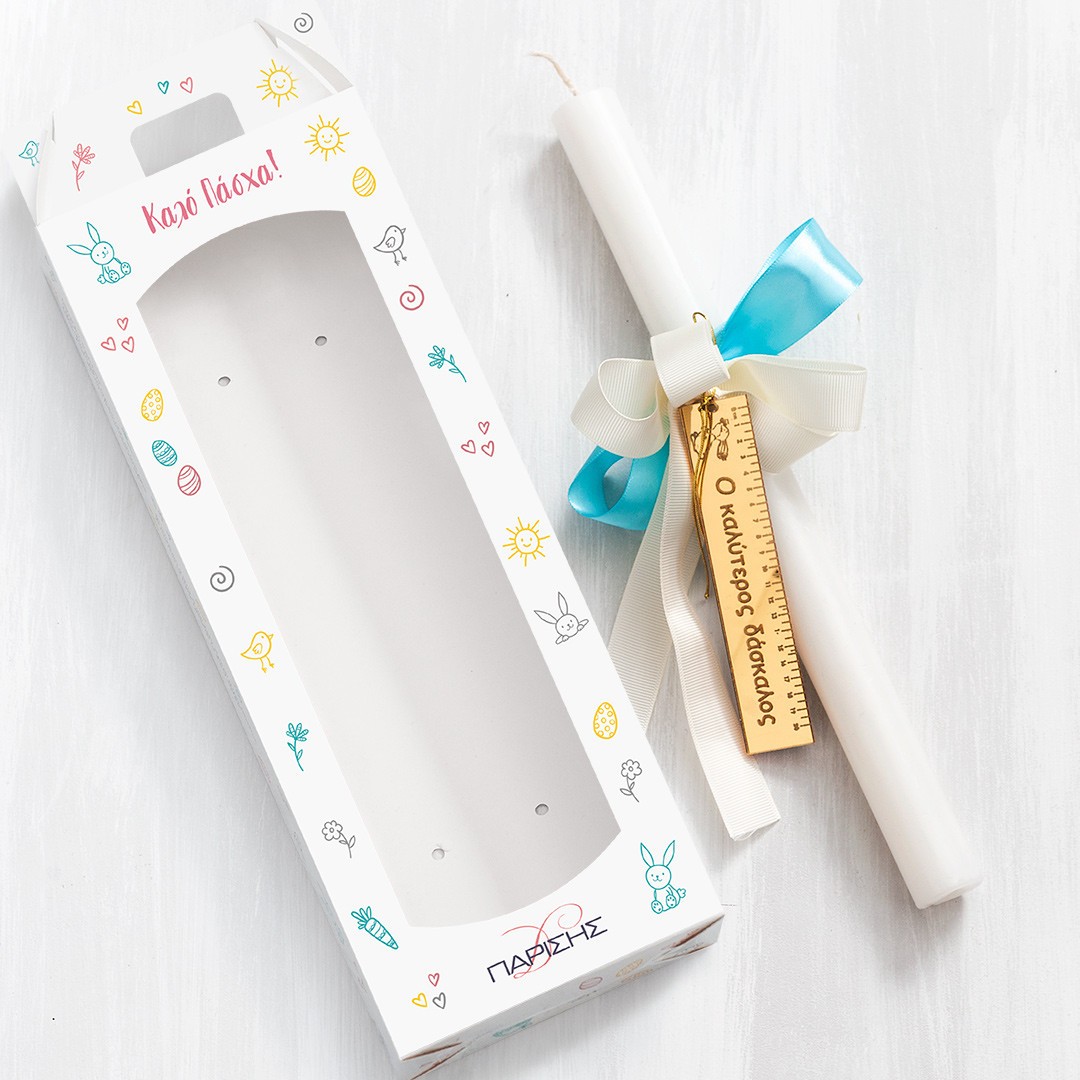 Πασχαλινή λαμπάδα διακοσμημένη με plexiglass χρυσό καθρέπτη χάρακα, χαραγμένο με την φράση "O καλύτερoς δάσκαλος" . Η λαμπάδα είναι τοποθετημένη σε χάρτινο κουτί με παράθυρο.