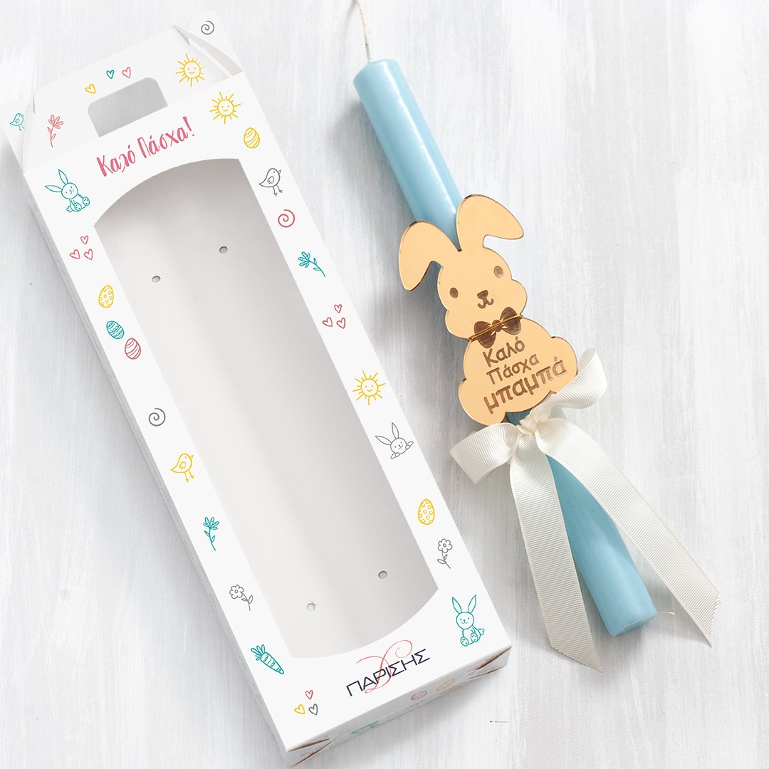 Πασχαλινή λαμπάδα διακοσμημένη με χρυσό plexiglass λαγουδάκι, χαραγμένο με την φράση "Καλό Πάσχα Μπαμπά". Η λαμπάδα είναι τοποθετημένη σε χάρτινο κουτί με παράθυρο.