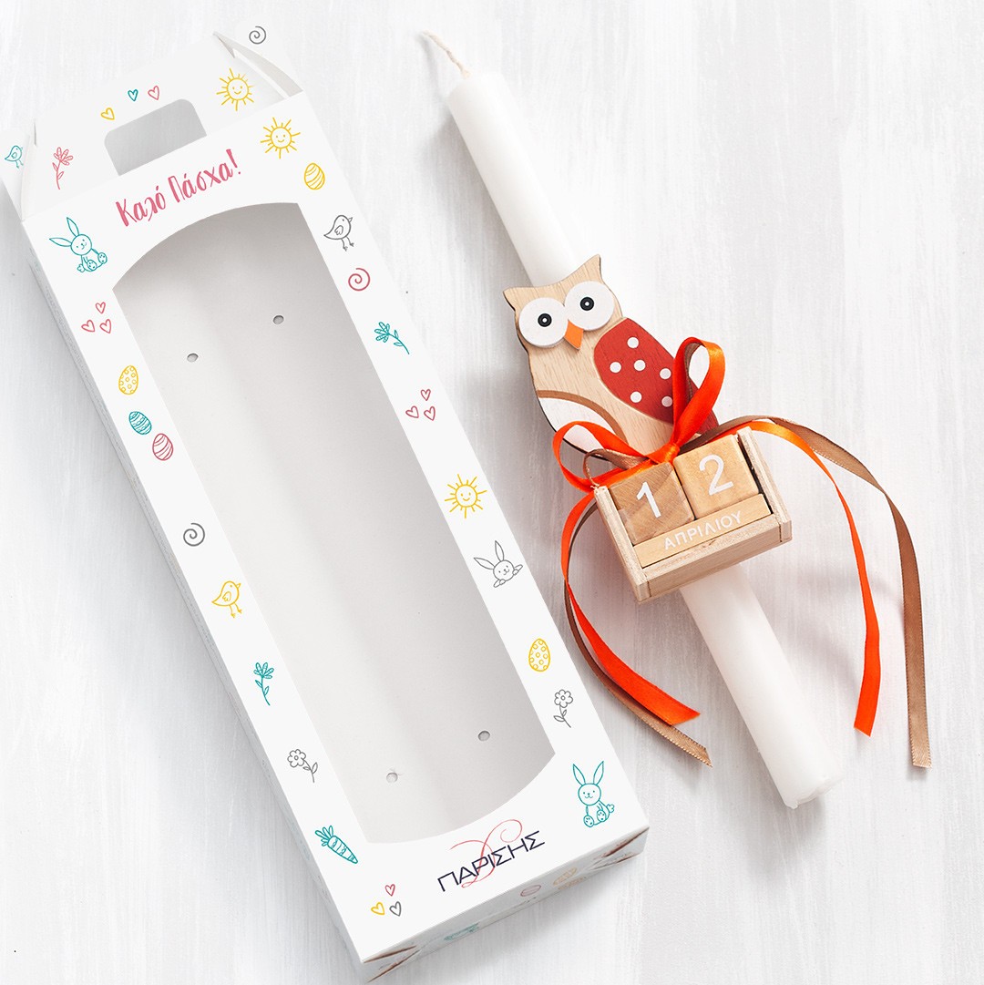 Πασχαλινή λαμπάδα με ξύλινο ημερολόγιο κουκουβάγια. Η λαμπάδα είναι διακοσμημένη με κορδέλες σε πορτοκαλί αποχρώσεις και είναι τοποθετημένη σε χάρτινο κουτί με παράθυρο.