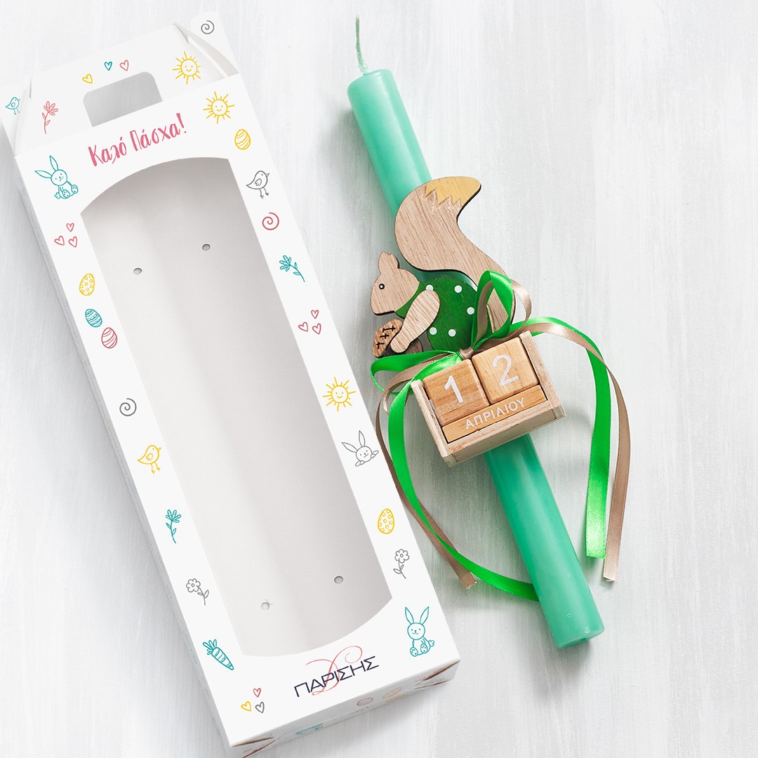 Πασχαλινή λαμπάδα με ξύλινο ημερολόγιο σκίουρο. Η λαμπάδα είναι διακοσμημένη με κορδέλες σε πράσινες αποχρώσεις και είναι τοποθετημένη σε χάρτινο κουτί με παράθυρο.