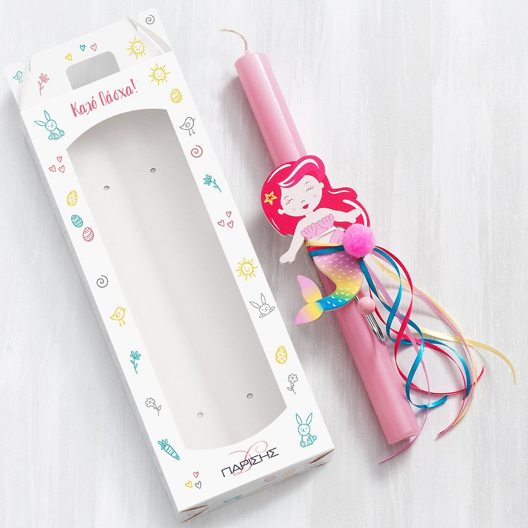 Πασχαλινή λαμπάδα με ξύλινη κρεμάστρα γοργόνα. Η λαμπάδα είναι στολισμένη με κορδέλες και pom pom σε ροζ απόχρωση και είναι τοποθετημένη σε χάρτινο κουτί με παράθυρο.