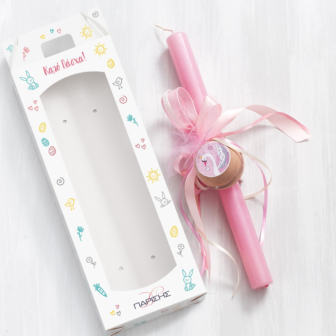 Πασχαλινή λαμπάδα με ξύλινο yo yo με αυτοκόλλητο κύκνο. Η λαμπάδα είναι στολισμένη με κορδέλες σε ροζ και εκρού αποχρώσεις και είναι τοποθετημένη σε χάρτινο κουτί με παράθυρο.