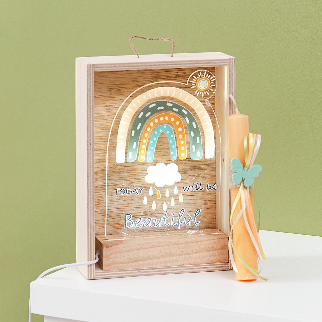 Πασχαλινό σετ δώρου σε ξύλινο natural κάδρο με led φωτισμό. Το δωράκι έχει θέμα το ουράνιο τόξο. Ολοκληρώνεται με διάφανο καπάκι pvc, που προσφέρει προστασία και άψογη παρουσίαση.