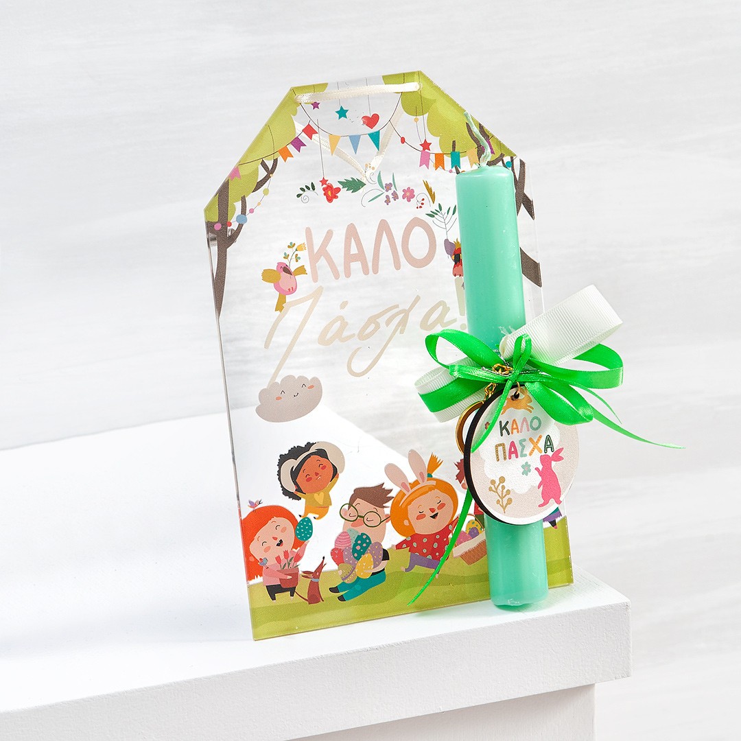 Πασχαλινή λαμπάδα με παιδάκια. Το δωράκι περιλαμβάνει : α) plexiglass διάφανη ετικέτα β) τη λαμπάδα διακοσμημένη με ξύλινο print στρογγυλό με την φράση "Καλό Πάσχα".