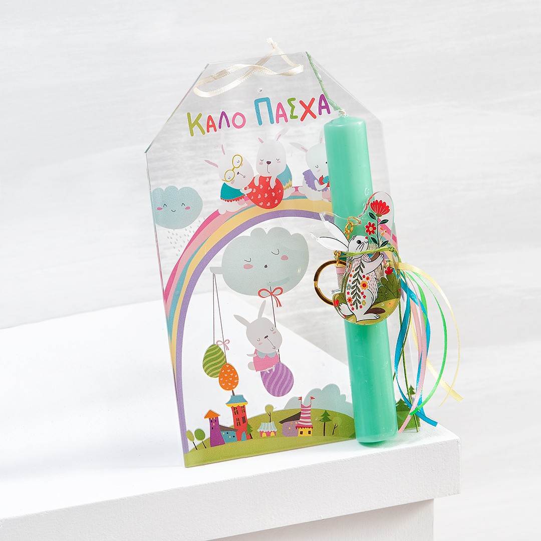 Πασχαλινή λαμπάδα με λαγουδάκια. Το δωράκι περιλαμβάνει : α) plexiglass διάφανη ετικέτα β) τη λαμπάδα διακοσμημένη με μπρελόκ plexiglass print λαγουδάκι.