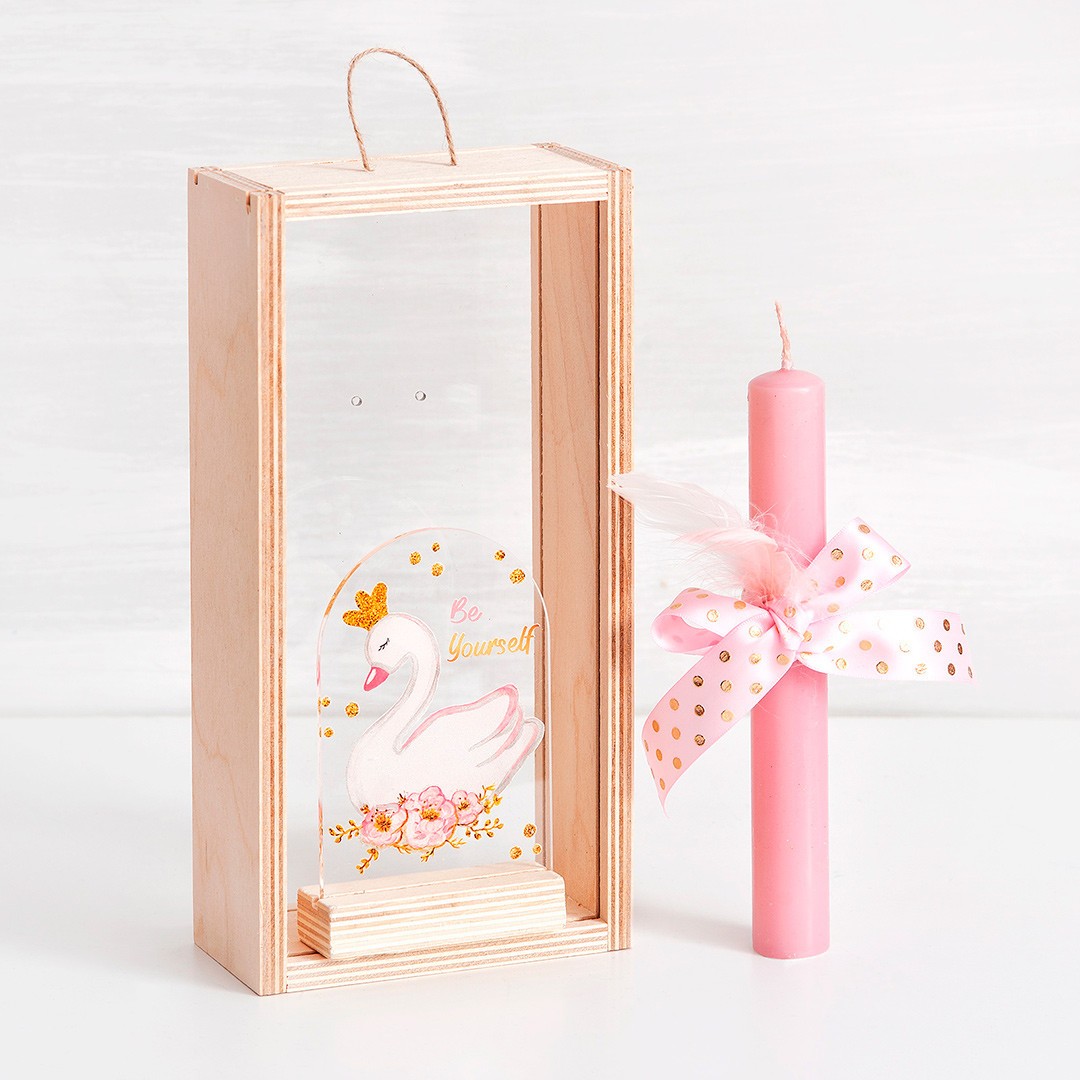 Πασχαλινό σετ δώρου σε ξύλινο natural κουτί. Το δωράκι έχει θέμα τον κύκνο σε διάφανο plexiglass. Συνοδεύεται από στολισμένη λαμπάδα με αντίστοιχα στοιχεία.
