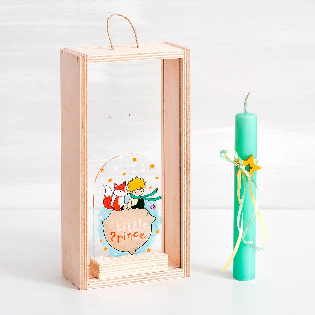 Πασχαλινό σετ δώρου σε ξύλινο natural κουτί. Το δωράκι έχει θέμα τον little prince σε διάφανο plexiglass. Συνοδεύεται από στολισμένη λαμπάδα με αντίστοιχα στοιχεία.