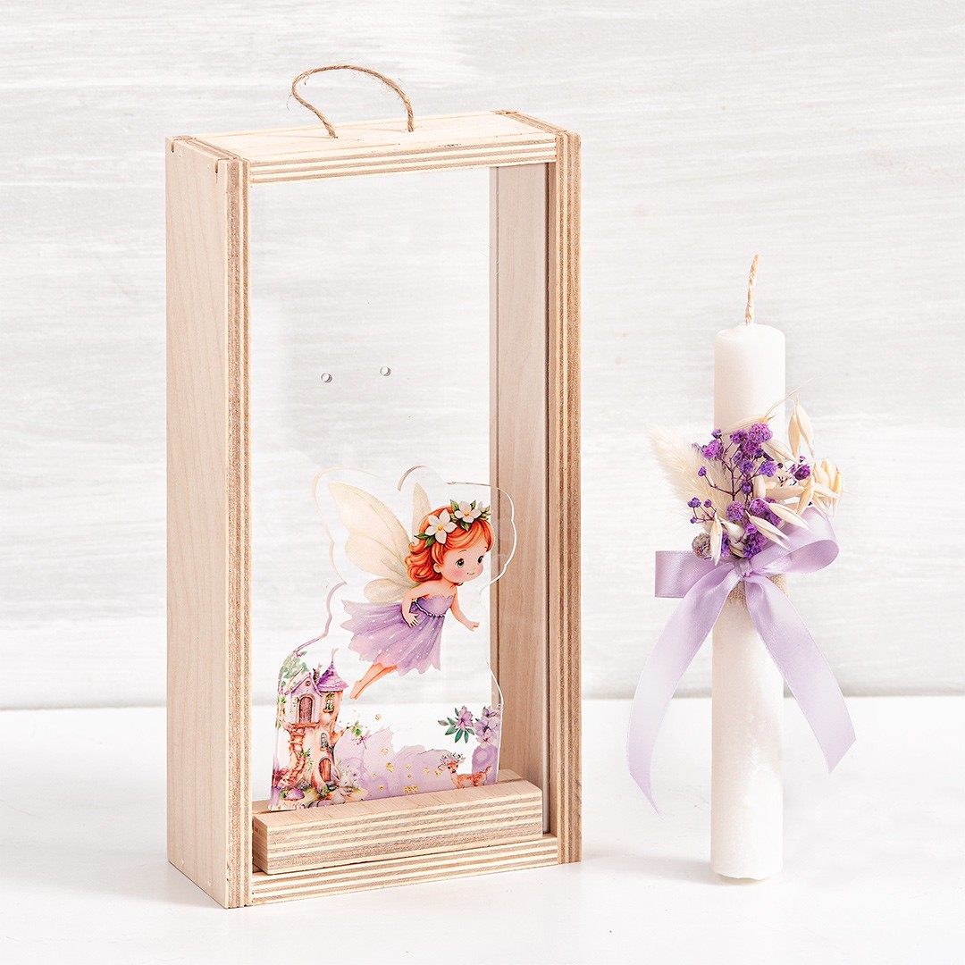 Πασχαλινό σετ δώρου σε ξύλινο natural κουτί.Το δωράκι έχει θέμα την λιλά νεράιδα σε διάφανο plexiglass. Συνοδεύεται από στολισμένη λαμπάδα με αποξηραμένα λουλούδια.