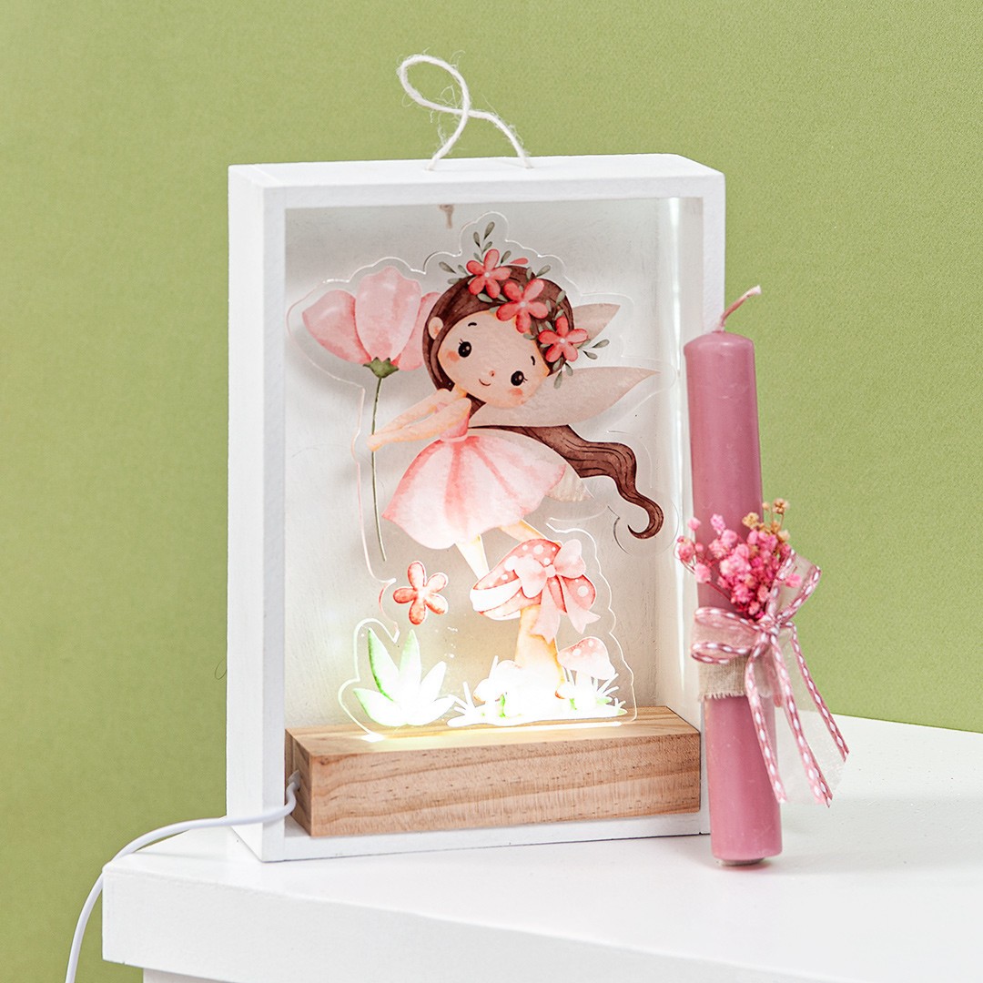 Πασχαλινό σετ δώρου σε ξύλινο natural κάδρο με led φωτισμό. Το δωράκι έχει θέμα μια νεράιδα σε ροζ αποχρώσεις. Ολοκληρώνεται με διάφανο καπάκι pvc, που προσφέρει προστασία και άψογη παρουσίαση.