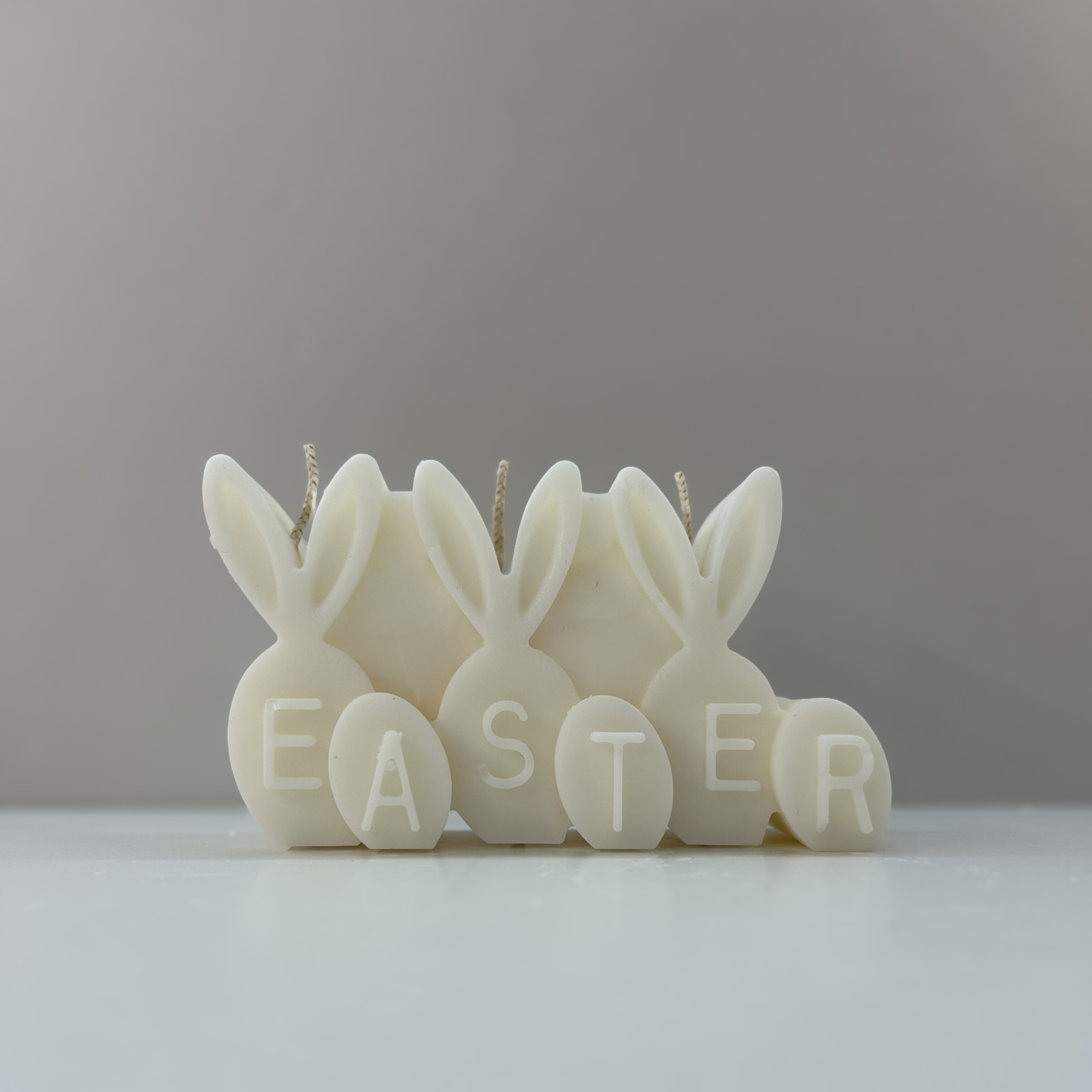 Το ιδιαίτερο στοιχείο αυτού του κεριού είναι η σύνθεση των λαγουδιών μαζί με τα αυγά που σχηματίζουν τη λέξη Easter. Η λεπτομέρεια αυτή δίνει στο κερί έναν παιχνιδιάρικο αλλά ταυτόχρονα κομψό χαρακτήρα, καθιστώντας το ιδανικό τόσο για διακόσμηση όσο και για δώρο.