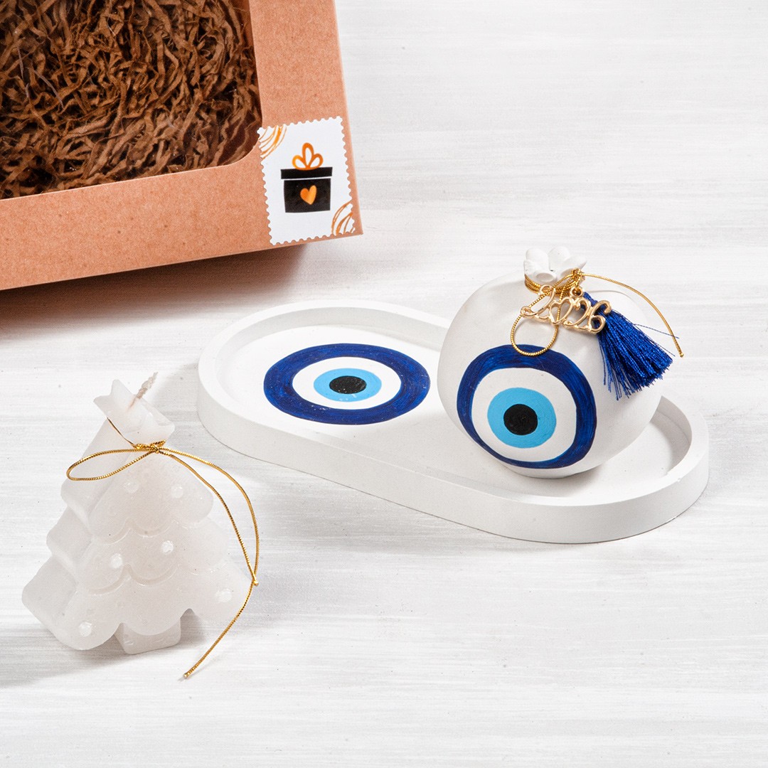 Χριστουγεννιάτικο σετ δώρου. Το δώρο αποτελείται από : αρωματικό κερί, γύψινο ζωγραφιστό ρόδι και ζωγραφιστό οβάλ πιατάκι. Στην τιμή περιλαμβάνεται το χάρτινο κουτί δώρου.