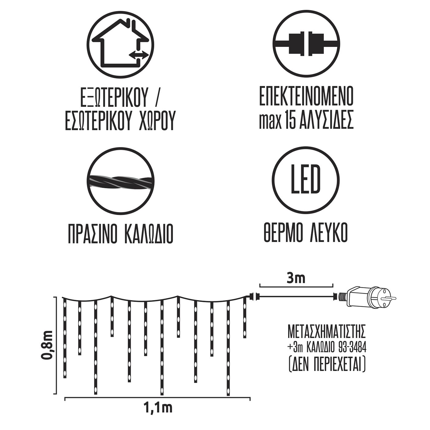 100 LED λευκό θερμό βροχή με επέκταση (σύνδεση max.15 σειρές) & 8 προγράμματα. Για εξωτερικό & εσωτερικό χώρο. Με πράσινο καλώδιο. Δεν περιέχεται ο μετασχηματιστής (κωδικός 93-3484) με 3m καλώδιο 110x80cm