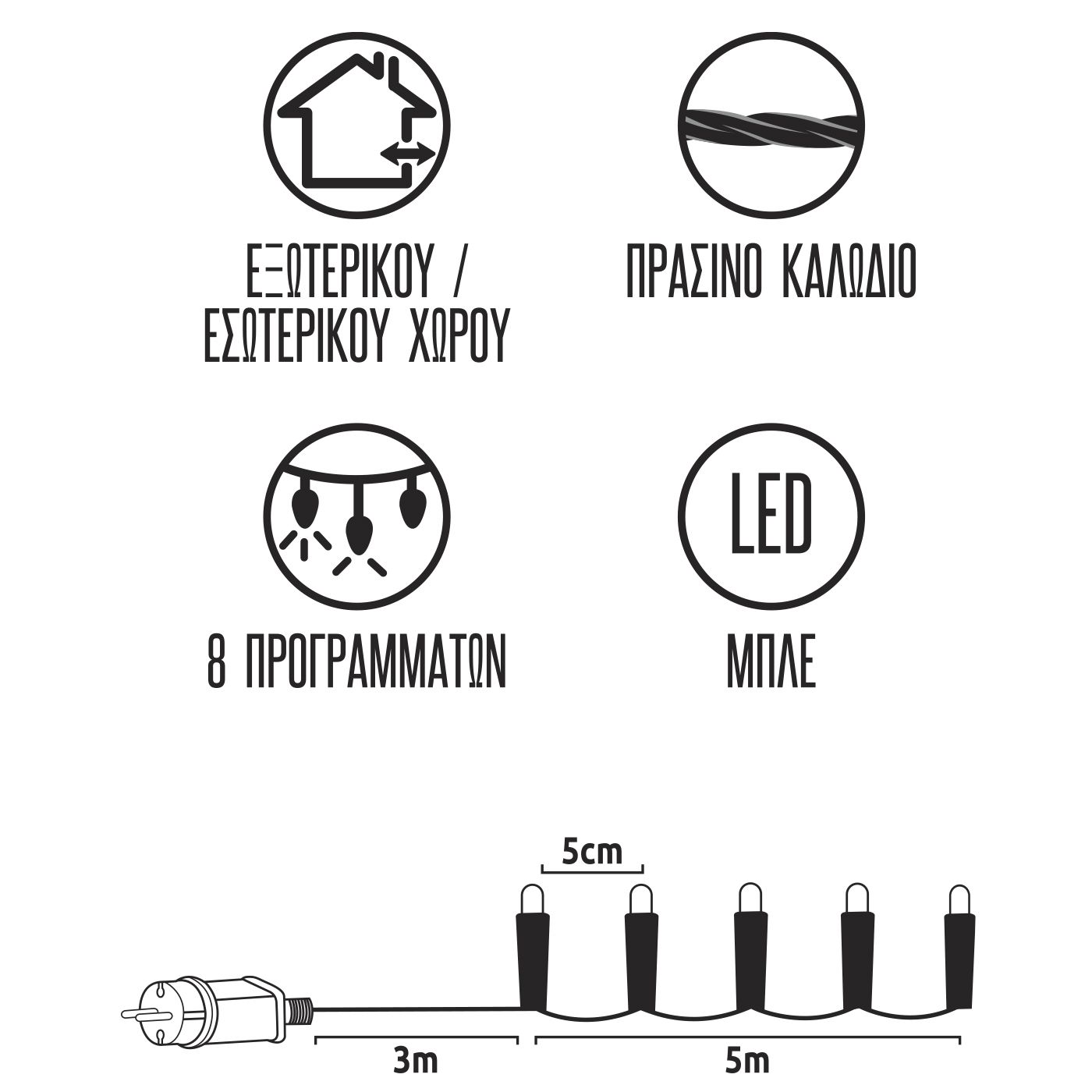 100 LED μπλε με controller 8 προγραμμάτων. Για εξωτερικό & εσωτερικό χώρο. Με πράσινο καλώδιο. Περιέχεται ο μετασχηματιστής IP44 8m