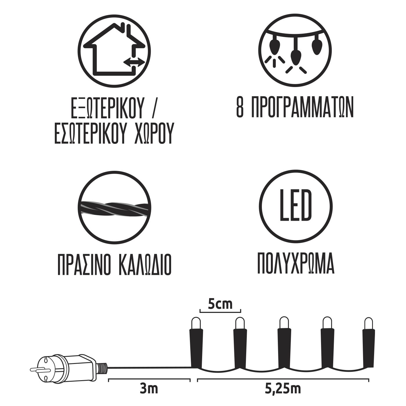 105 LED πολύχρωμα με controller 8 προγραμμάτων. Για εξωτερικό & εσωτερικό χώρο. Με πράσινο καλώδιο. Περιέχεται ο μετασχηματιστής IP44 8,25m
