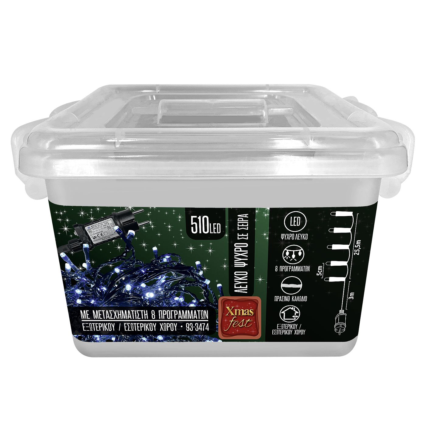 510 LED λευκό ψυχρό με controller 8 προγραμμάτων. Για εξωτερικό & εσωτερικό χώρο. Με πράσινο καλώδιο. Περιέχεται ο μετασχηματιστής IP44 28,5m