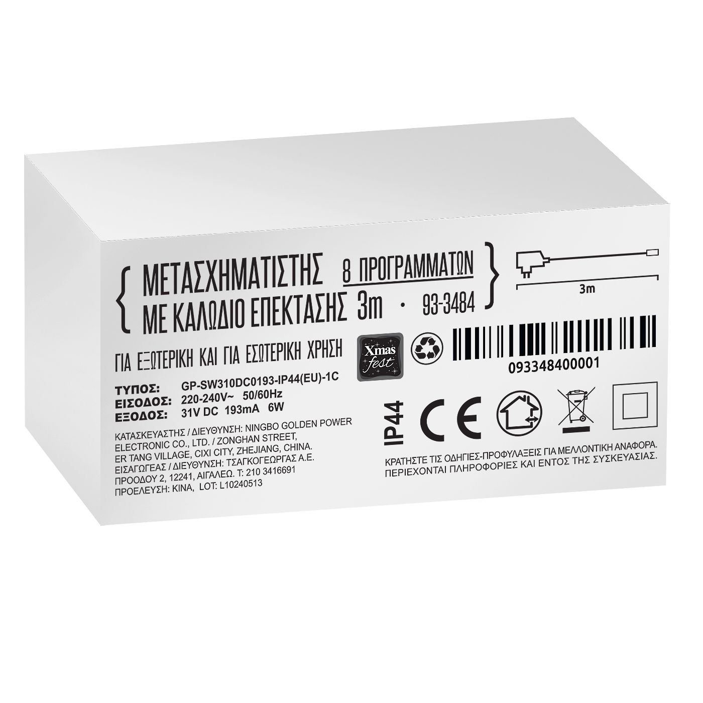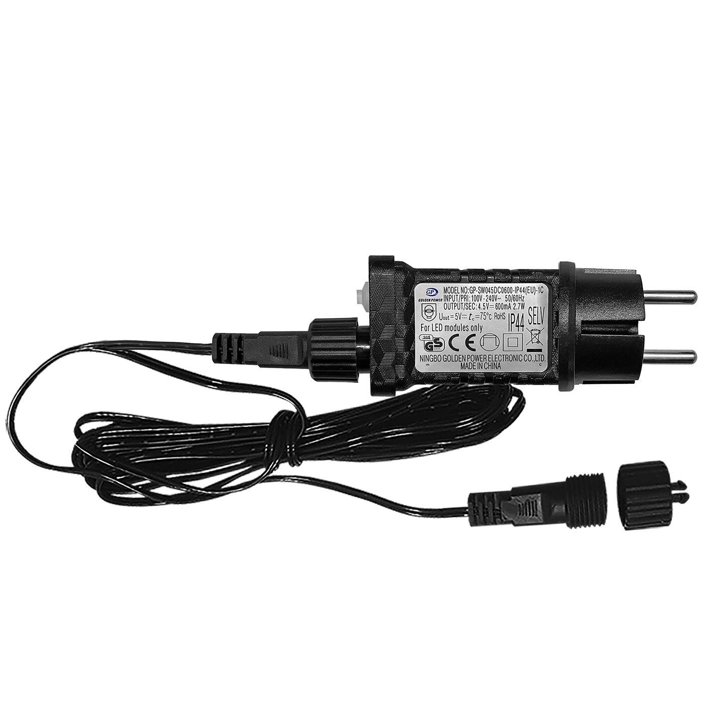 Μετασχηματιστής IP44 με 8 προγράμματα. Κατάλληλος για τα επεκτεινόμενα λαμπάκια με προγράμματα Xmasfest. Για σύνδεση max.15x100 LED ή 3x510 LED. Για εξωτερικό & εσωτερικό χώρο. Περιλαμβάνει 3m καλώδιο με επέκταση 3m