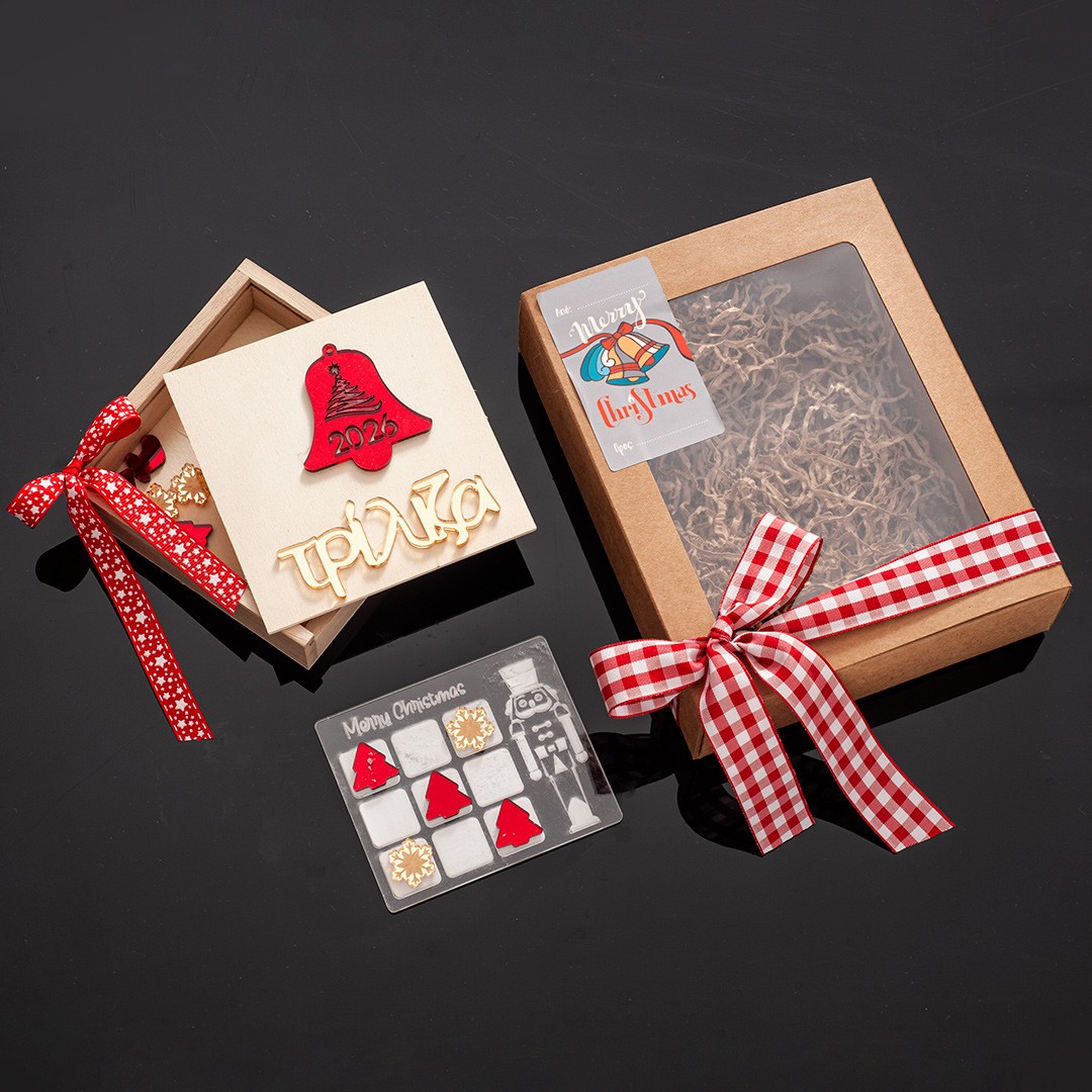 Χριστουγεννιάτικο παιχνίδι τρίλιζα σε ξύλινο κουτάκι. Το ταμπλό είναι plexiglass διάφανο με χαραγμένο καρυοθραύστη και ευχή. Περιλαμβάνει 10 πούλια σε χρώμα κόκκινο και χρυσό με σχήμα δέντρου και χιονονιφάδας. Στην τιμή περιλαμβάνεται το χάρτινο κουτί δώρου.