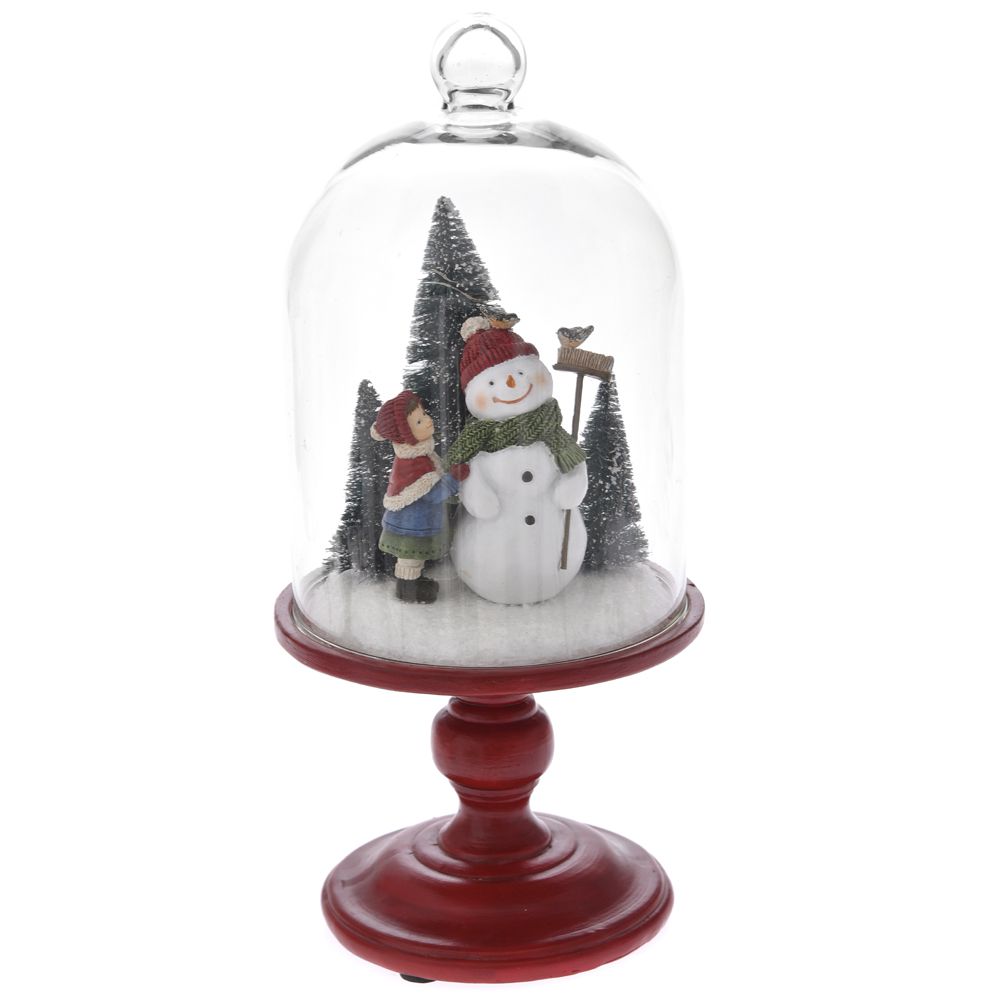 Διακοσμητικός χιονάθρωπος και παιδάκι , φωτιζόμενα δενδράκια , σε γυάλινη καμπάνα. Ειναι όλα κολημένα πάνω σε ξύλινη κόκκινη βάση. Λειτουργεί με τρεις ΑΑΑ μπαταρίες που δεν περιέχονται.