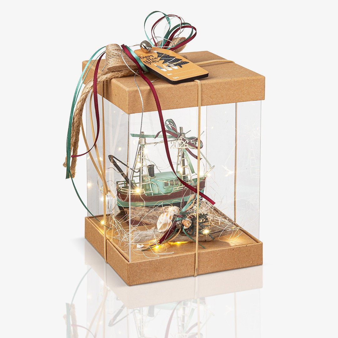 Χριστουγεννιάτικη αντίκα με φωτάκια led σε κουτί. Περιλαμβάνει μεταλλικό vintage καράβι και ναυτική διακόσμηση. Το κουτί είναι στολισμένο με κορδέλες και ξύλινη ετικέτα αποστολής.