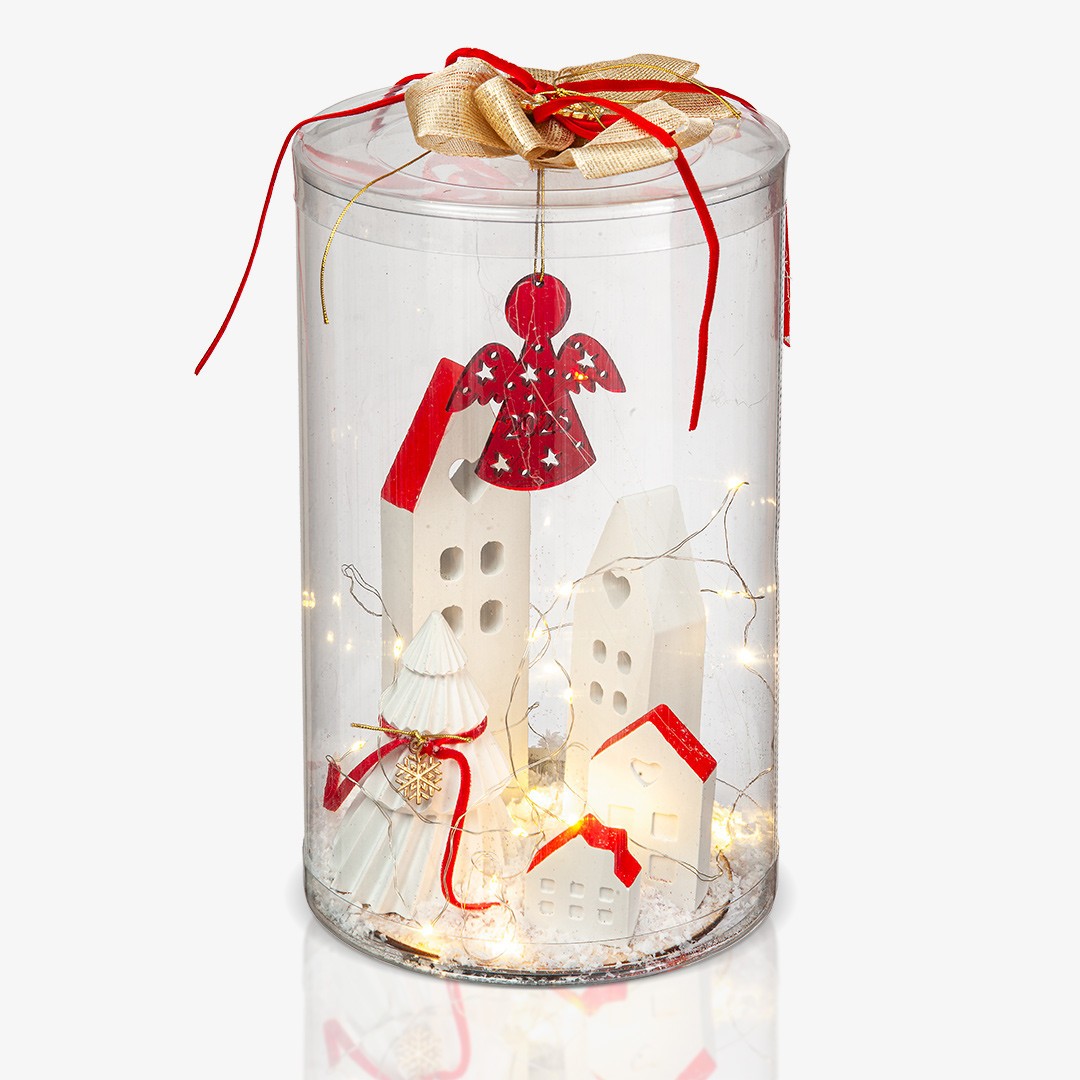 Χριστουγεννιάτικο χωριό σε διάφανο κουτί με φωτάκια led. Περιλαμβάνει γύψινα σπιτάκια, δέντρο και διακοσμητικό χιόνι .Το κουτί είναι στολισμένο με κορδέλες.