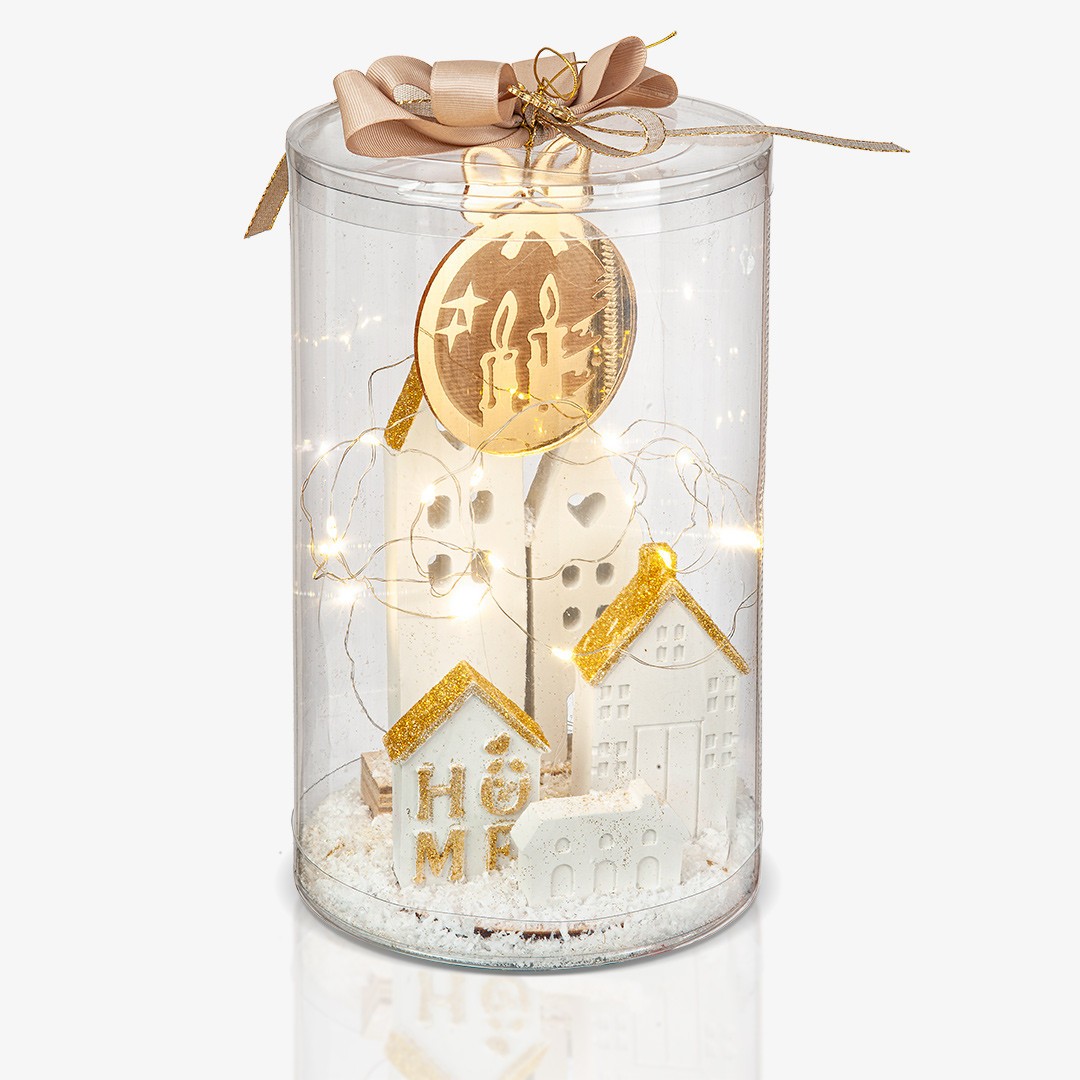Χριστουγεννιάτικο χωριό σε διάφανο κουτί με φωτάκια led. Περιλαμβάνει γύψινα σπιτάκια και διακοσμητικό χιόνι .Το κουτί είναι στολισμένο με κορδέλες.