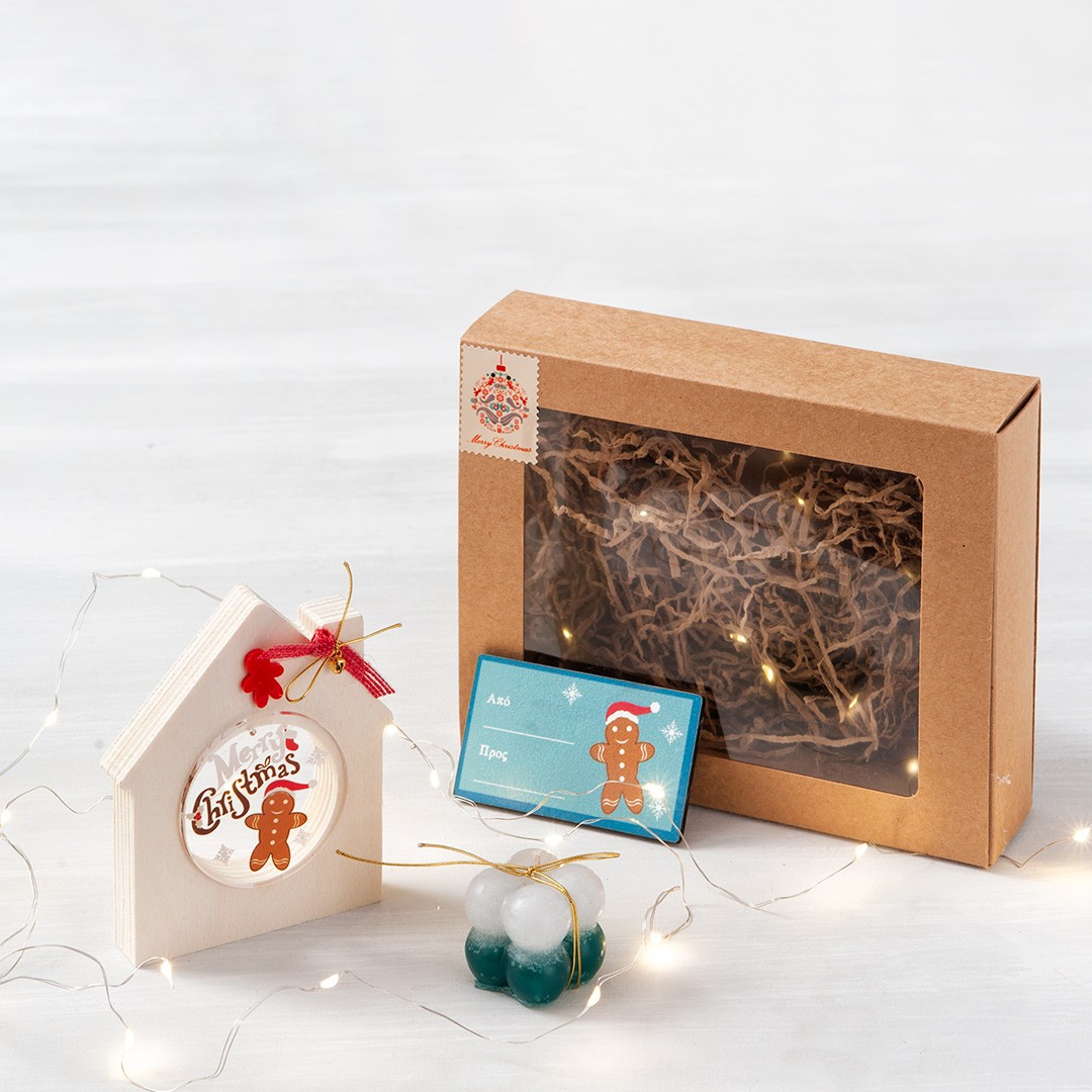 Χριστουγεννιάτικο σετ δώρου σε χάρτινο κουτί με θέμα τον μπισκοτούλη. Περιλαμβάνει α) ξύλινο διακοσμητικό σπιτάκι με plexiglass παράσταση β) αρωματικό κεράκι bubble γ) ξύλινη Χριστουγεννιάτικη ετικέτα αποστολής.