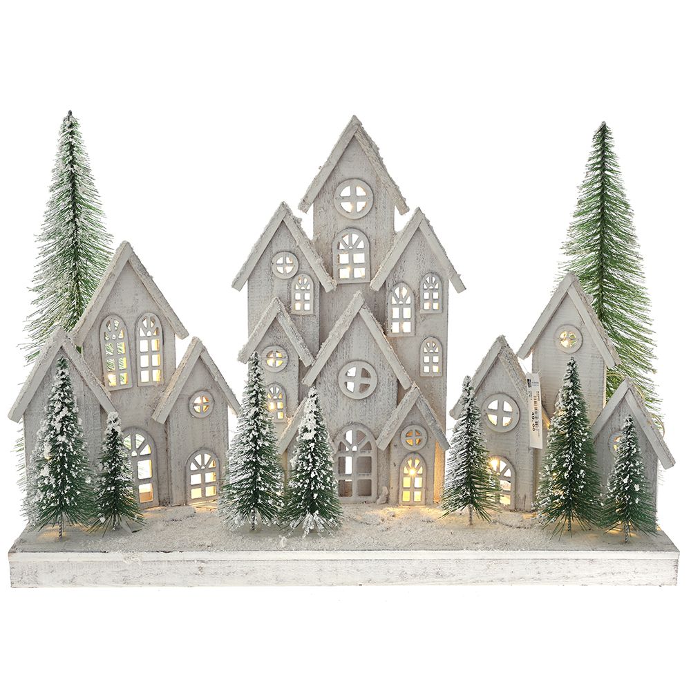 Ξύλινα Χριστουγεννιάτικα σπίτια με δεντράκια και φως. Λειτουργεί με 3 μπαταρίες ΑΑ οι οποίες δεν περιέχονται.