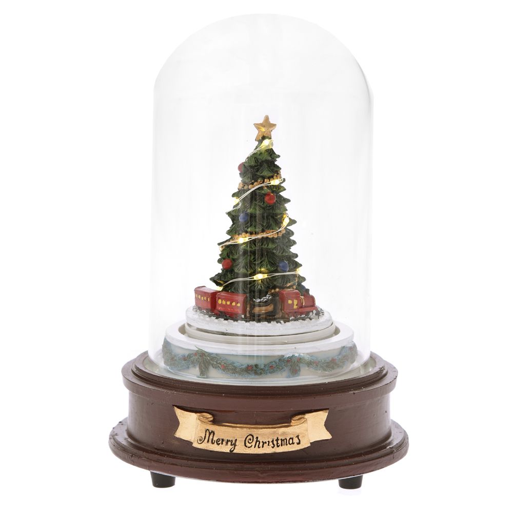 Διακοσμητικό φωτιζόμενο δενδράκι σε γυάλινη καμπάνα. Το δενδράκι γυρνάει γύρω γύρω. Ειναι όλα κολημένα πάνω σε ξύλινη βάση. Λειτουργεί με μπαταρίες 3AAA που δεν περιέχονται.