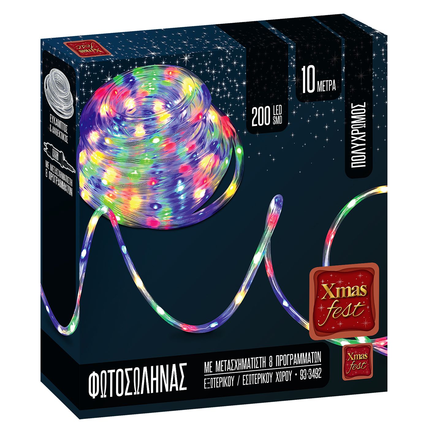 Φωτοσωλήνας 200 LED 10m Πολύχρωμος με Προγράμματα IP44 ø11mm 10m (+3m Extra Καλώδιο) Xmasfest 1133512