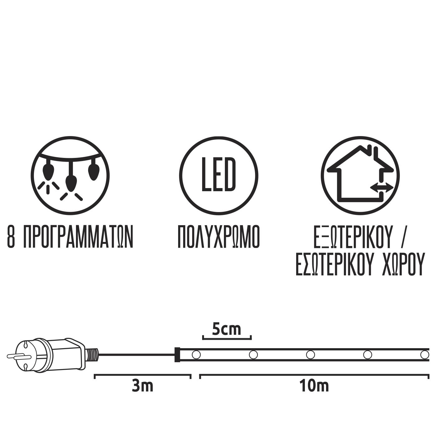 200 LED SMD. Πολύχρωμος με controller 8 προγραμμάτων. Για εξωτερικό & εσωτερικό χώρο. Περιέχεται ο μετασχηματιστης IP44 ø11mm 10m (+3m extra καλώδιο)