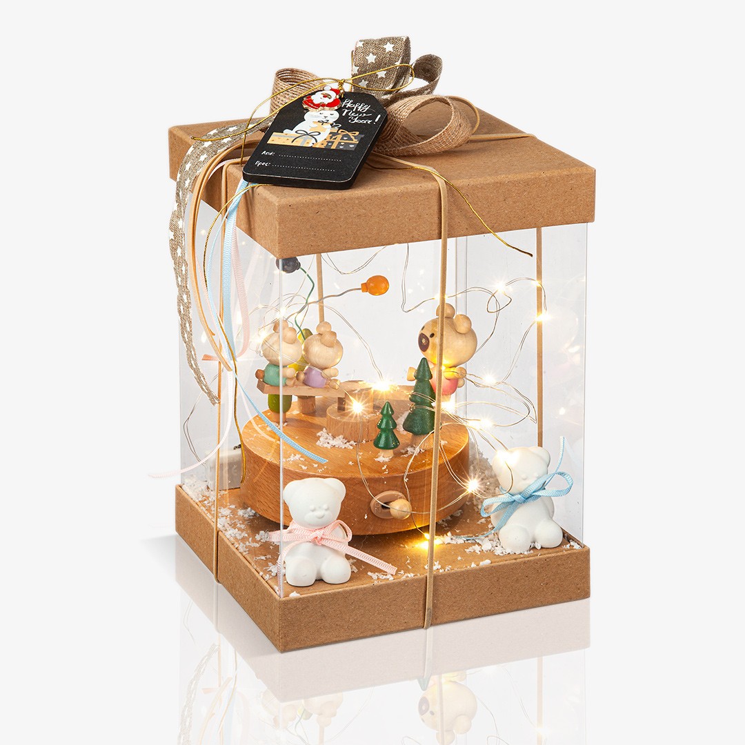 Χριστουγεννιάτικο μουσικό κουτί με φωτακια led. Περιλαμβάνει ξύλινο μουσικό κουτί σε natural χρώμα με τραμπάλα πάνω στην οποία κάθονται η μαμά αρκουδίνα και τα παιδάκια της και κρατούν μπαλονάκια .Το κουτί είναι στολισμένο με κορδέλες και ξύλινη ετικέτα αποστολής.