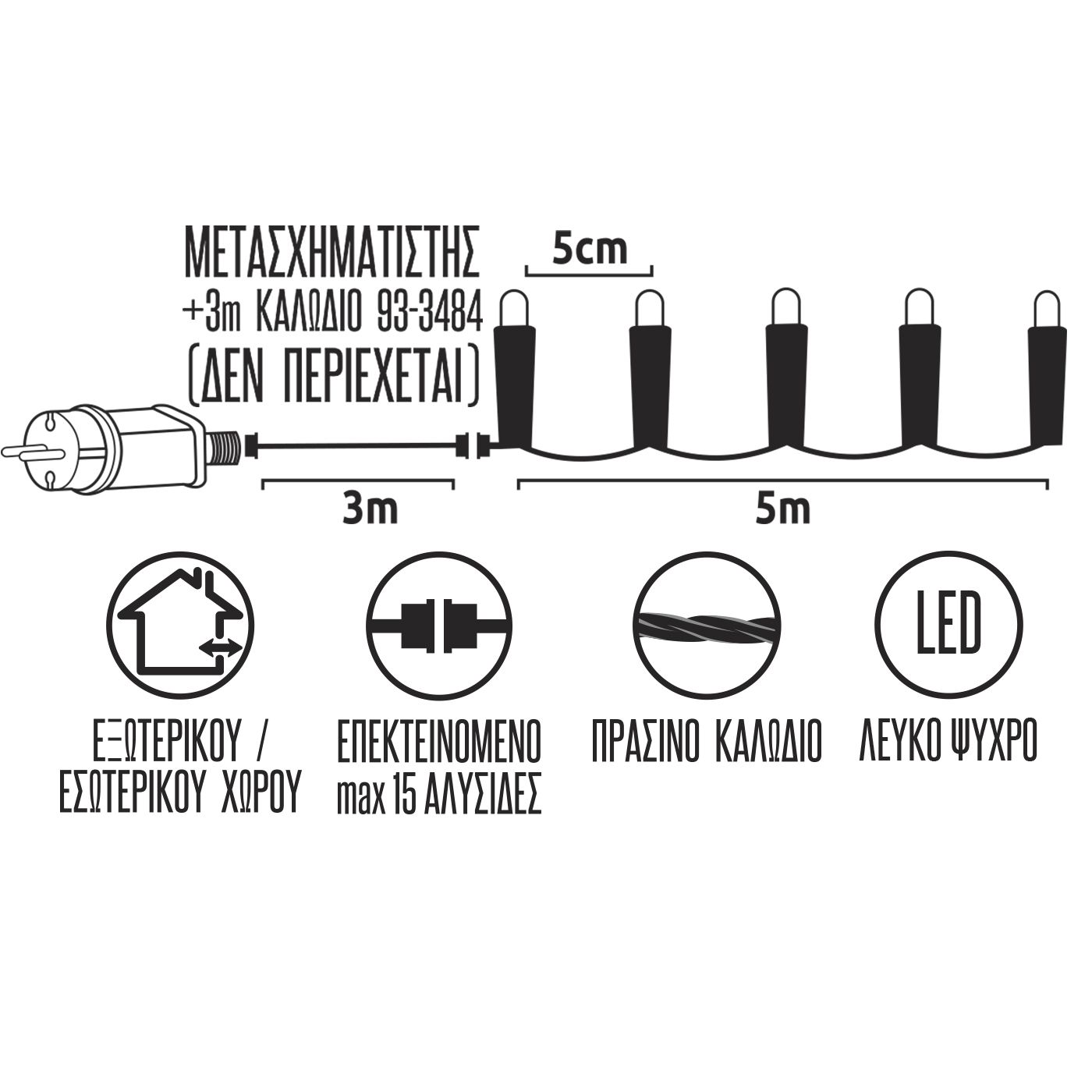 100 LED λευκό ψυχρό με επέκταση (σύνδεση max.15 σειρές) & 8 προγράμματα. Για εξωτερικό & εσωτερικό χώρο. Με πράσινο καλώδιο. Δεν περιέχεται ο μετασχηματιστής (κωδικός 93-3484) με 3m καλώδιο 5m