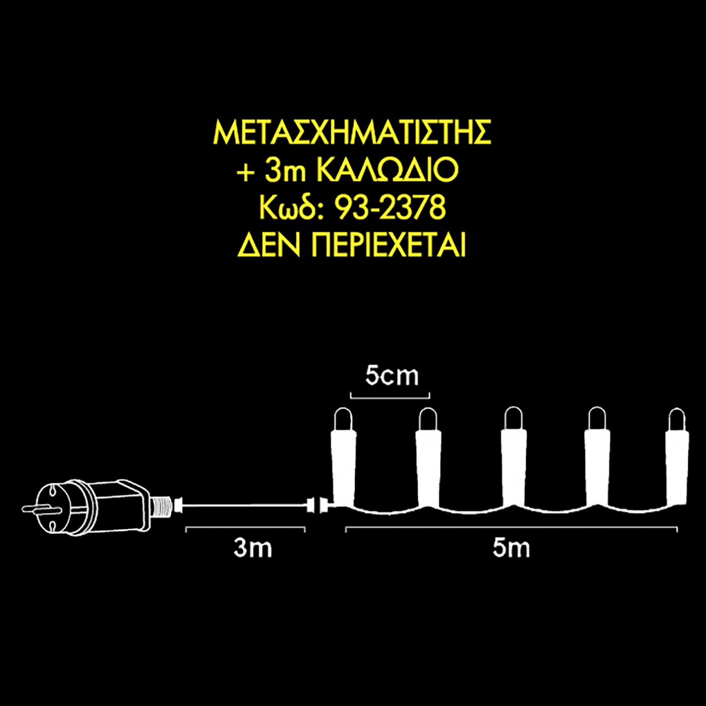 100 LED χρωματιστά επεκτεινόμενα (σύνδεση max.5 σειρές), σταθερού φωτισμού. Με πράσινο καλώδιο. Για εξωτερικό & εσωτερικό χώρο. Δεν περιέχεται ο μετασχηματιστής (κωδικός 93-2378) με 3m καλώδιο 5m