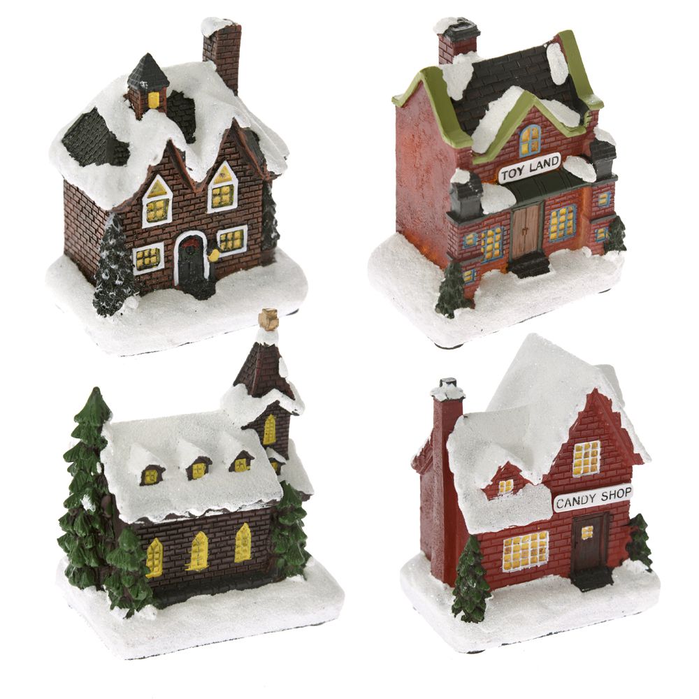 Μικρά πολυρέζιν φωτιζόμενα σπιτάκια σε κουτί περίπου 8x6x10εκ σε 4 διαφορετικά σχέδια. Λειτουργούν με μπαταρίες LR44 που περιέχονται. Ιδανικά για την δημιουργία Χριστουγεννιάτικων χωριών.