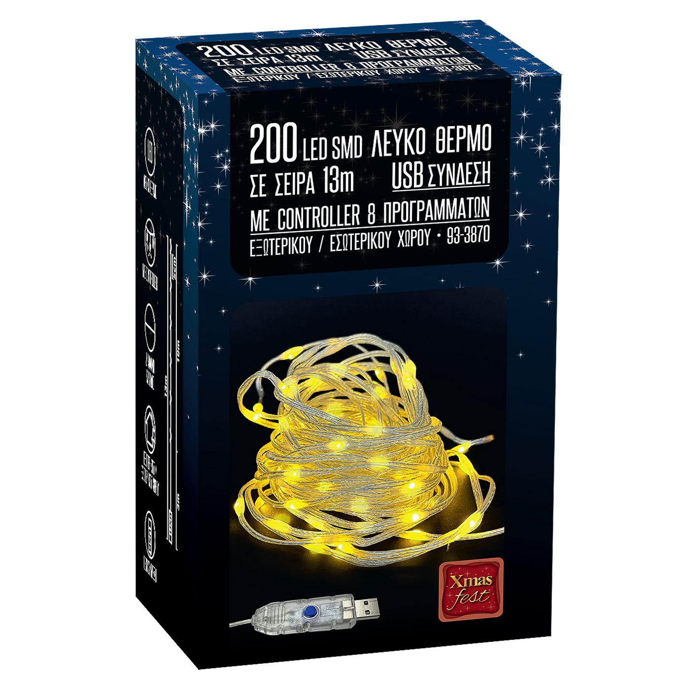 200 LED SMD λευκό θερμό. USB σύνδεση με controller 8 προγραμμάτων. Για εξωτερικό & εσωτερικό χώρο. Με διάφανο καλώδιο 13m