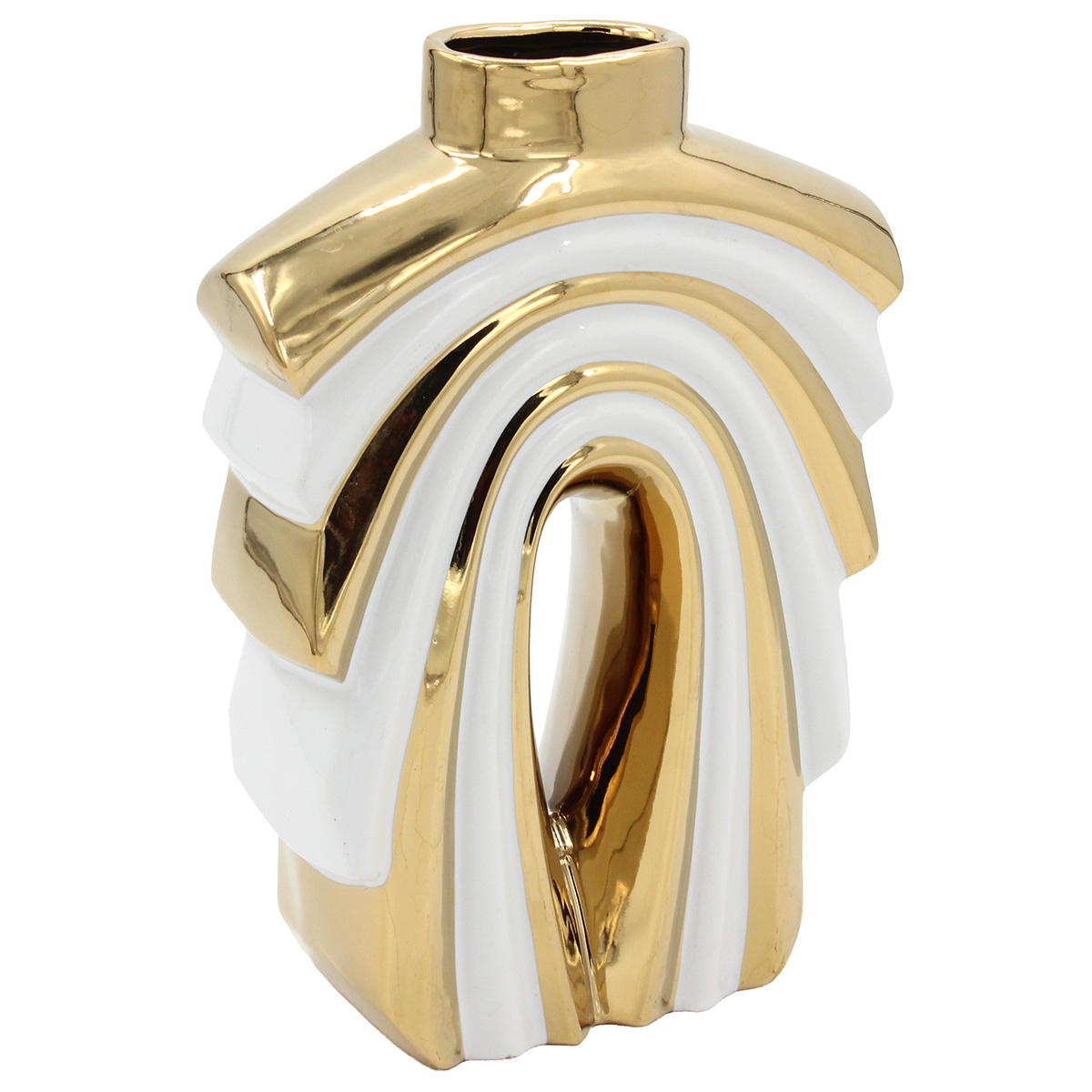Αυτό το διακοσμητικό κεραμικό ανθοδοχείο συνδυάζει κομψότητα και μοντέρνα αισθητική. Ιδανικό για κονσόλες ή ράφια. Ο λευκός και χρυσός χρωματικός συνδυασμός προσθέτει λάμψη στον χώρο.