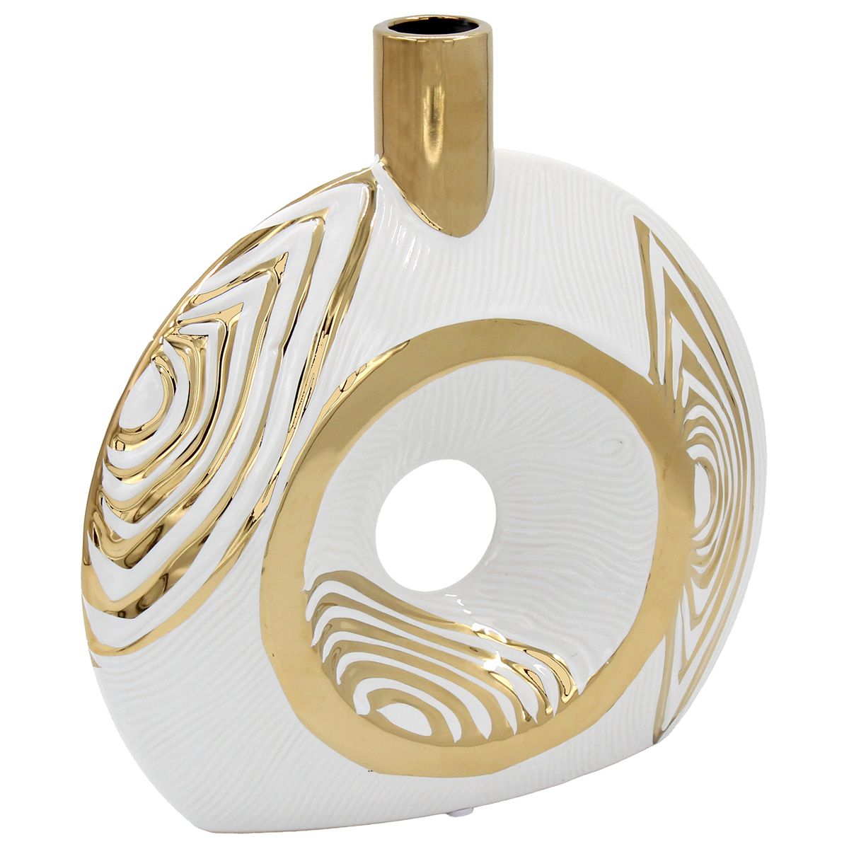 Αυτό το ανθοδοχείο - διακοσμητικό κεραμικό σε λευκό και χρυσό χρώμα 25Χ7Χ26 εκ. προσφέρει αριστοκρατικό χαρακτήρα και λαμπερή λεπτομέρεια. Ιδανικό για εκλεπτυσμένες διακοσμήσεις.