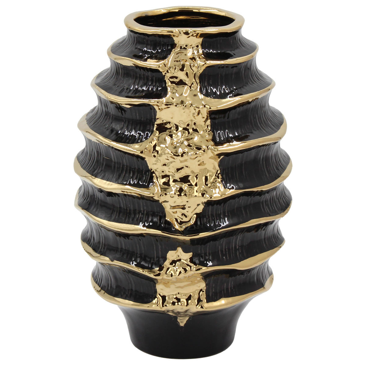 Αυτό το ανθοδοχείο - διακοσμητικό κεραμικό σε μαύρο και χρυσό χρώμα Φ16Χ24 εκ. αποπνέει πολυτέλεια και αρμονία. Ένα κομμάτι που αναβαθμίζει κάθε περιβάλλον.