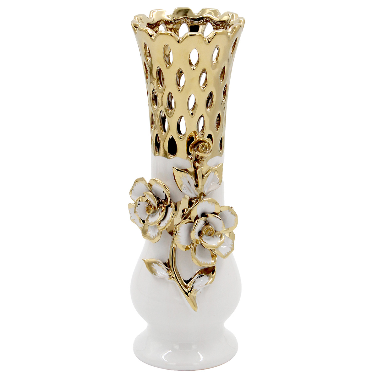 Αυτό το υπέροχο κεραμικό ανθοδοχείο Φ8Χ25 εκ. σε λευκό και χρυσό με λουλούδια θα αναδείξει κάθε σύνθεση, δίνοντας αριστοκρατικό χαρακτήρα στον χώρο σας.