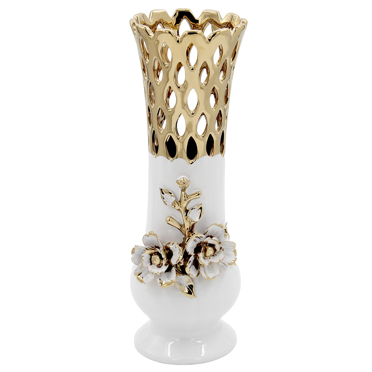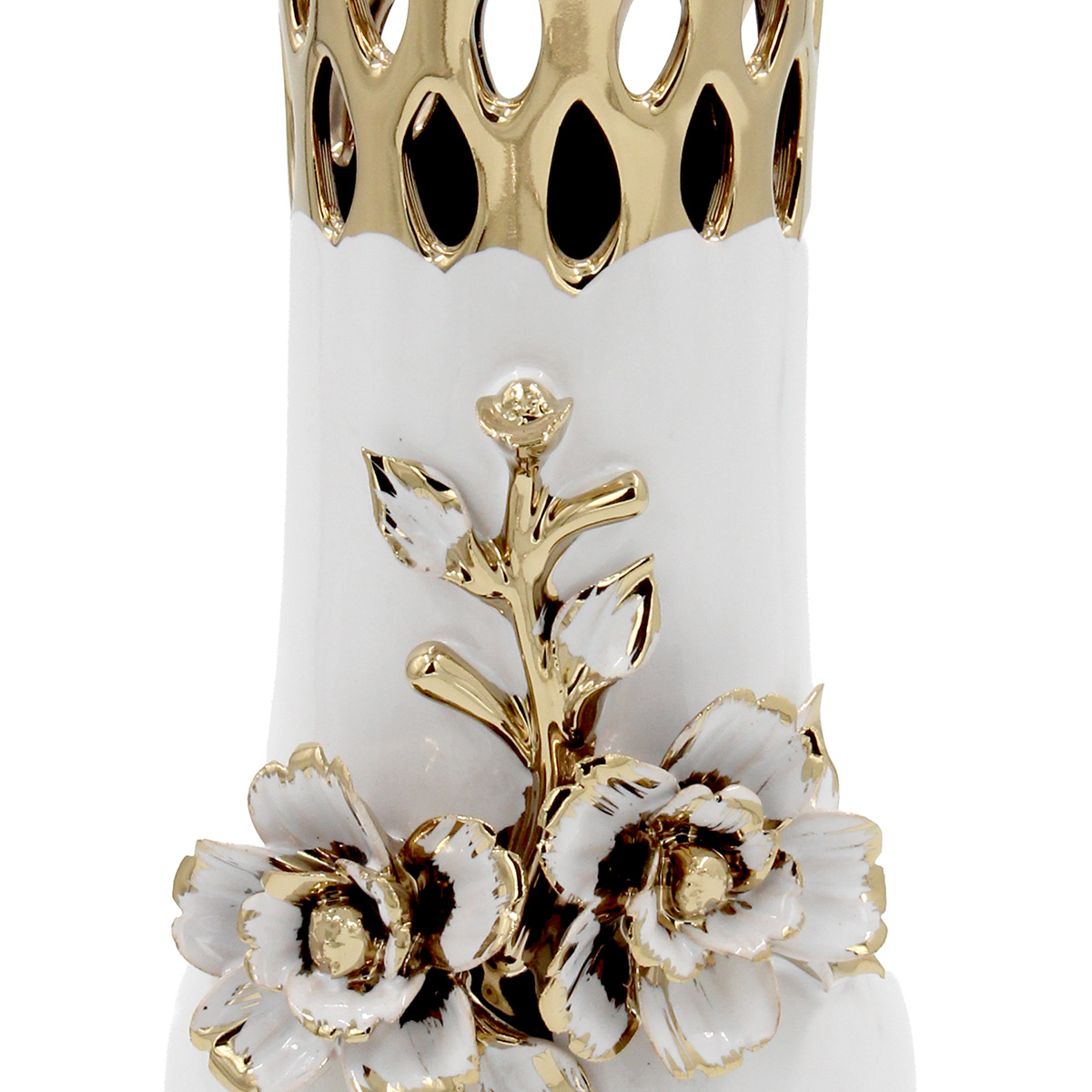 Αυτό το εκλεπτυσμένο κεραμικό ανθοδοχείο Φ9,5Χ30 εκ. σε λευκό και χρυσό με λουλούδια ξεχωρίζει για την κομψότητα και την πολυτέλειά του. Ιδανικό για εντυπωσιακή διακόσμηση.