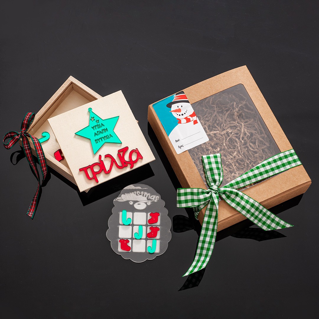 Χριστουγεννιάτικο παιχνίδι τρίλιζα σε ξύλινο κουτάκι. Το ταμπλό είναι από διάφανο plexiglass σε σχήμα Αι Βασίλη. Περιλαμβάνει 10 πούλια σε χρώμα κόκκινο και πράσινο με σχήμα Χριστουγεννιάτικης κάλτσας και ζαχαρωτού. Στην τιμή περιλαμβάνεται το χάρτινο κουτί δώρου.